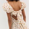 Bridge the seasons beautifully with the Adahlia floral midi dress—a cream midi dress with an autumnal floral print perfect for your new fall wardrobe. This puff sleeve midi dress is adorned with a charming lace trim bow appliqué at front neck and al dramatic bow tie at the back.