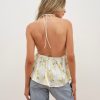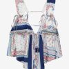 Inspired by vintage silhouettes, the Cassandra tie front blue blouse exudes summer nostalgia. This open-back summer top is featured in an all-over vintage handkerchief-inspired print and adorned with delicate bows throughout.