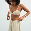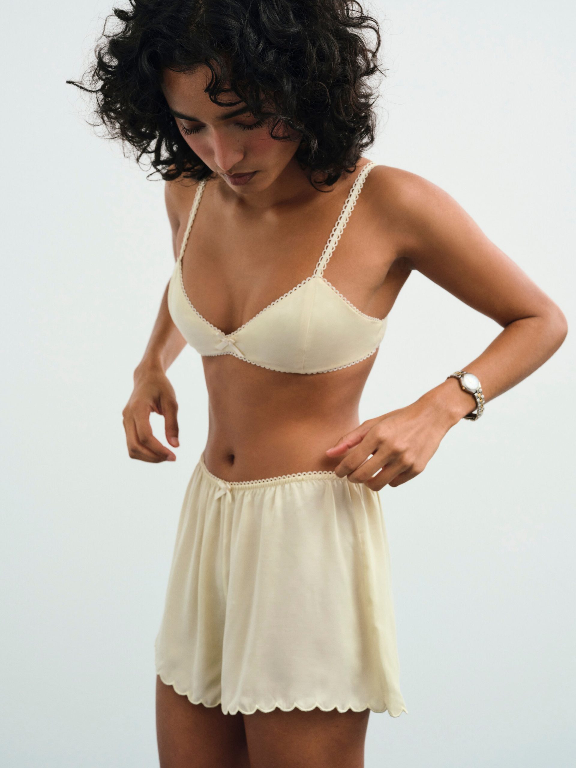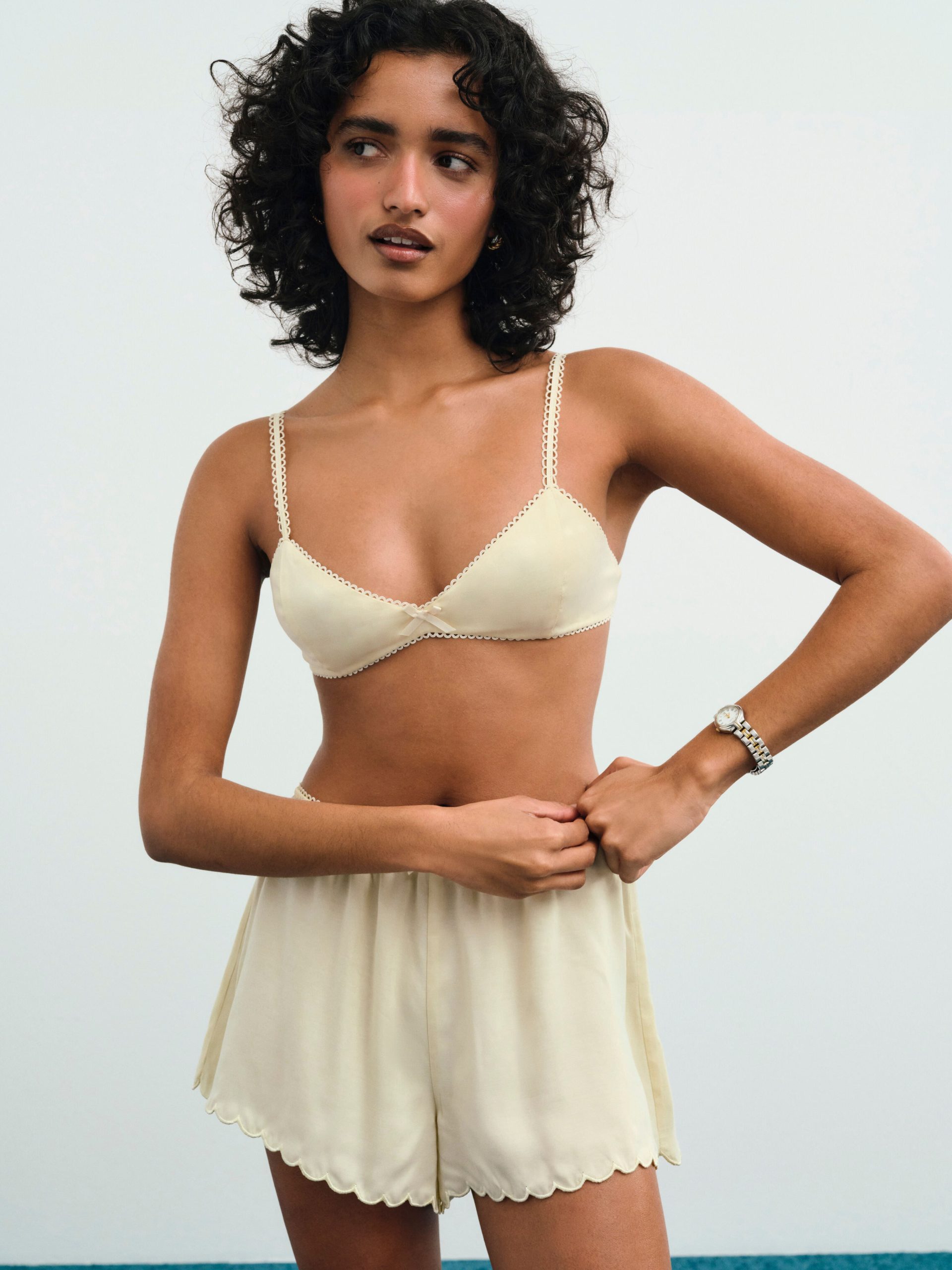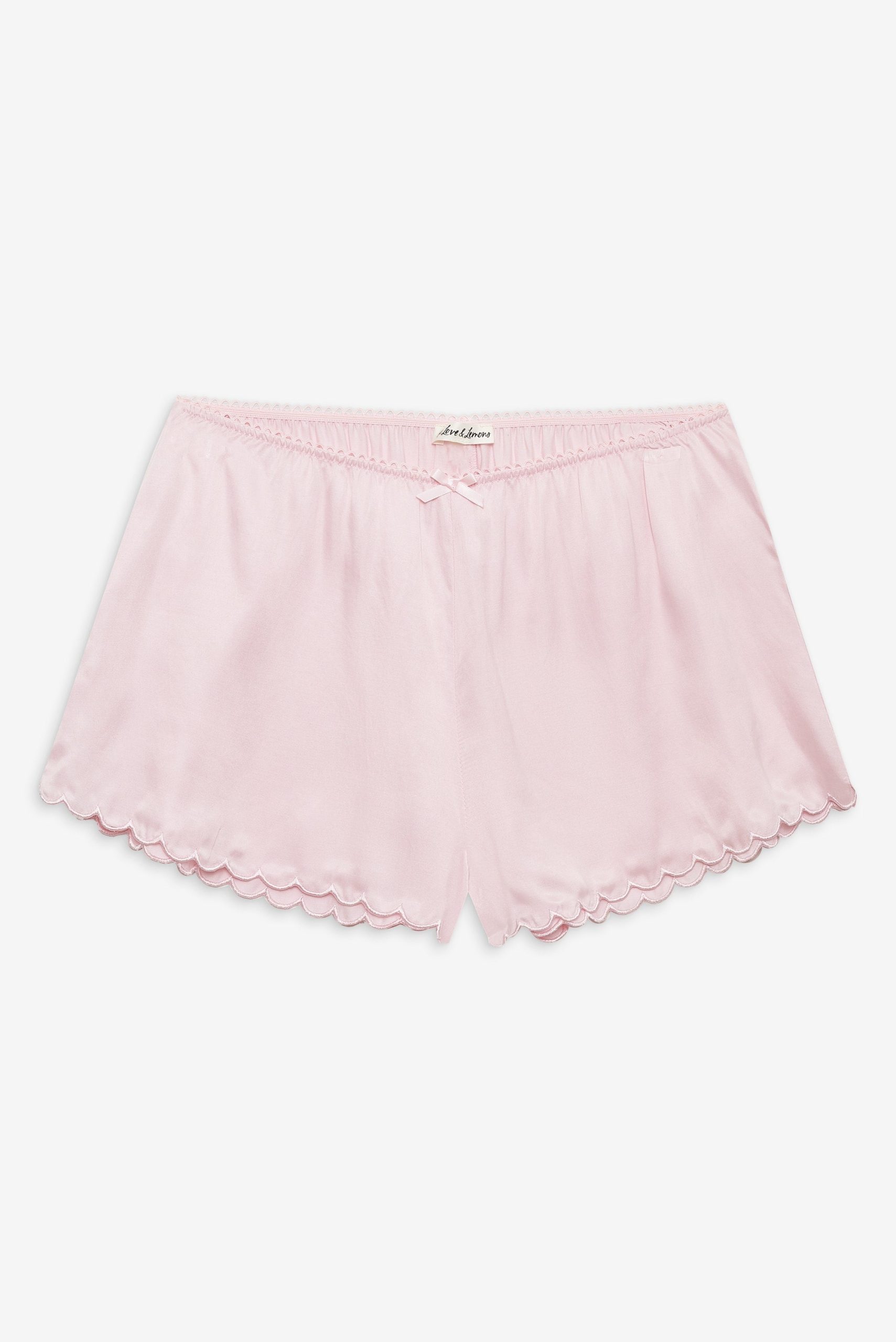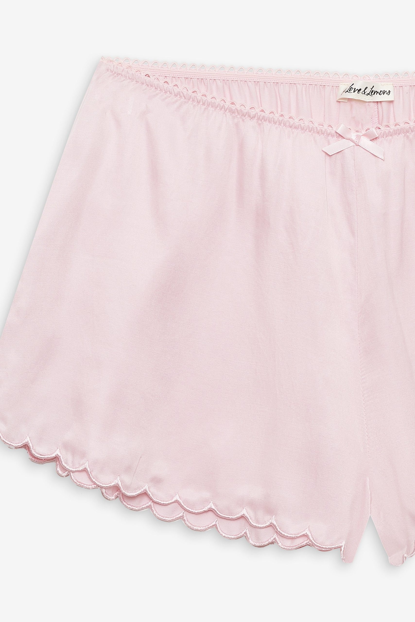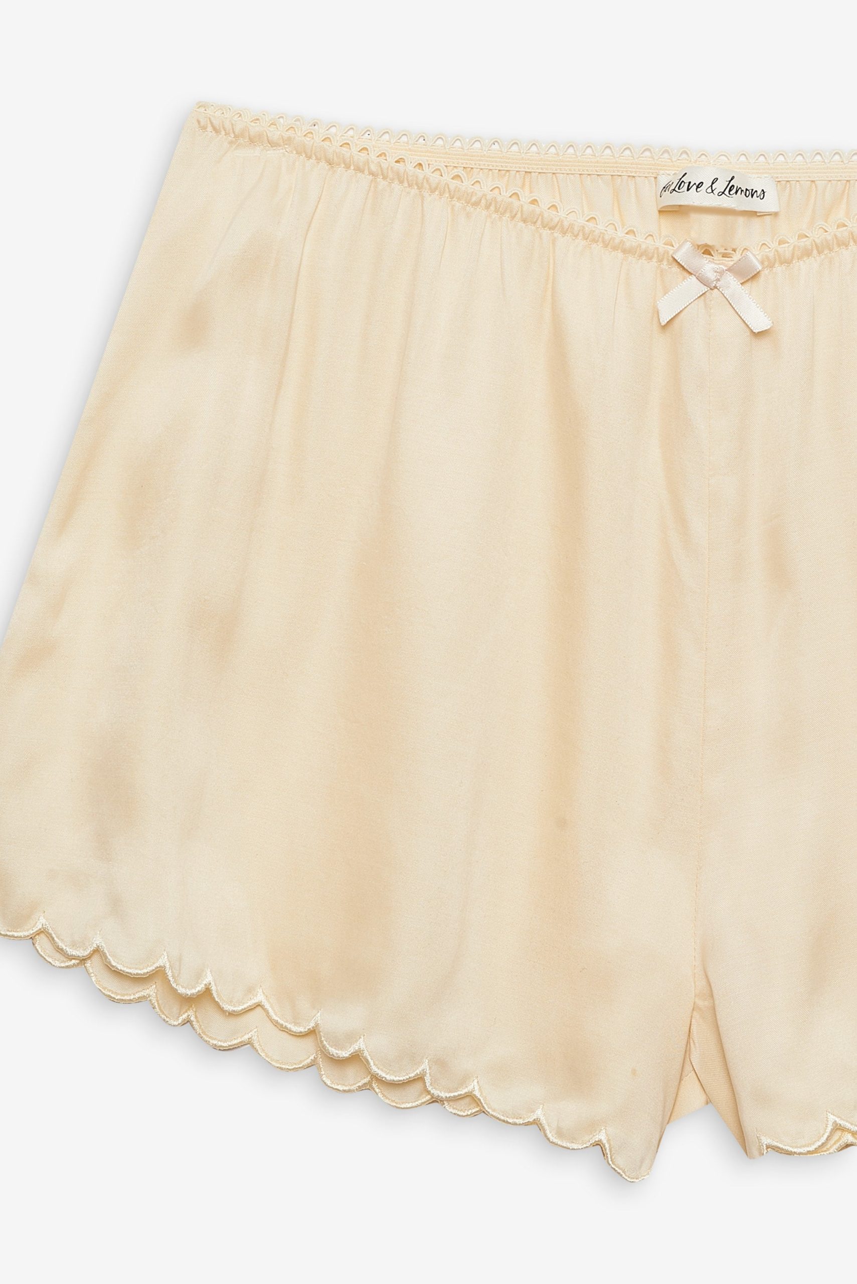 Adorned with a sweetly chic bow appliqué at center front waist and a scalloped hem—the Clarabell Cupro yellow short exudes femininity. Featuring a gathered waist with elasticized picot trim, this casual short is a polished wardrobe staple.