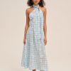 Laid-back summer days meets outdoor nostalgia with the Claudette gingham midi dress. Crafted in a nostalgic white and blue gingham, this halter dress features pleated bodice and a functional tie at neck which can be wrapped and styled to your desired aesthetic.
