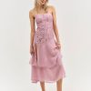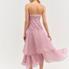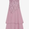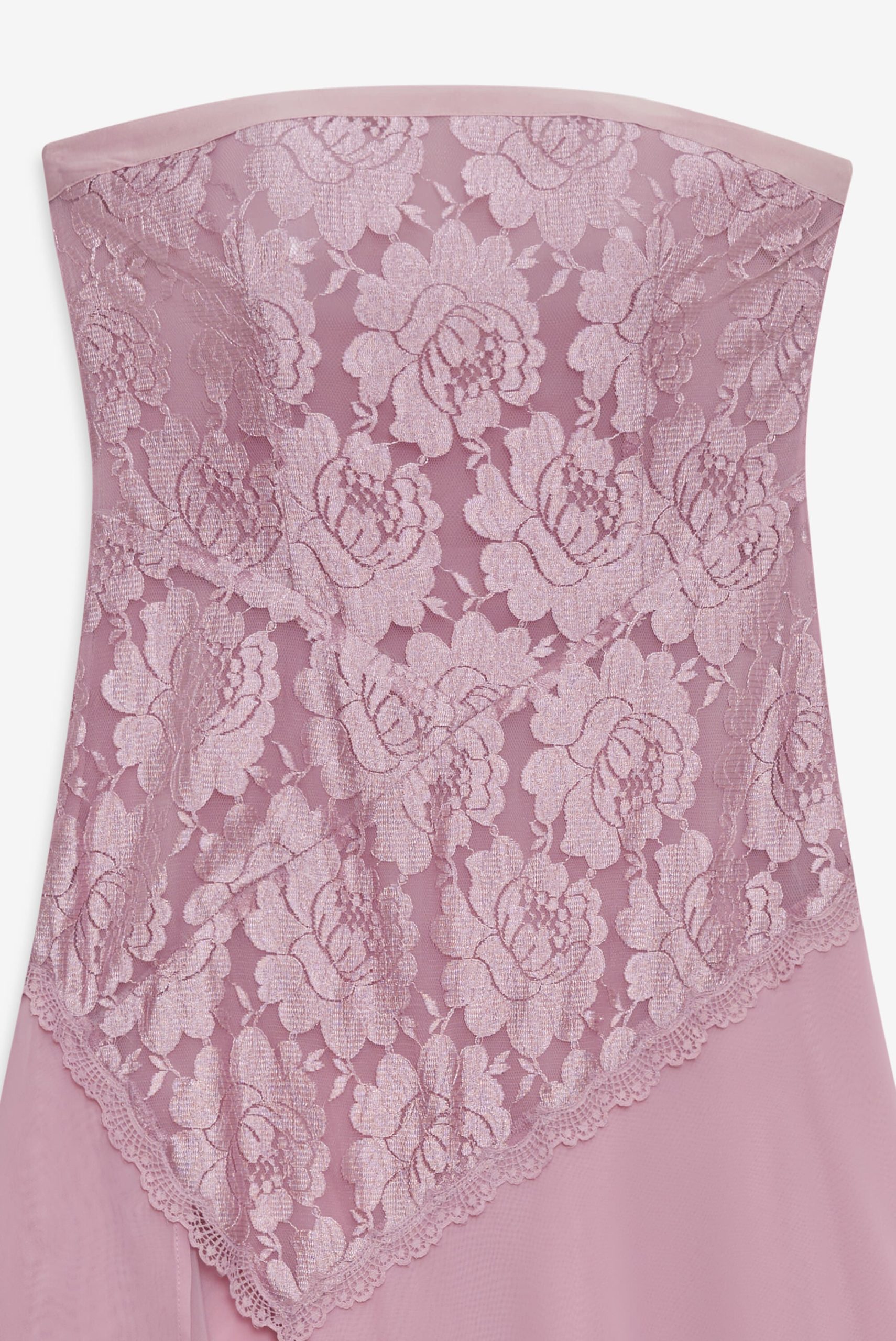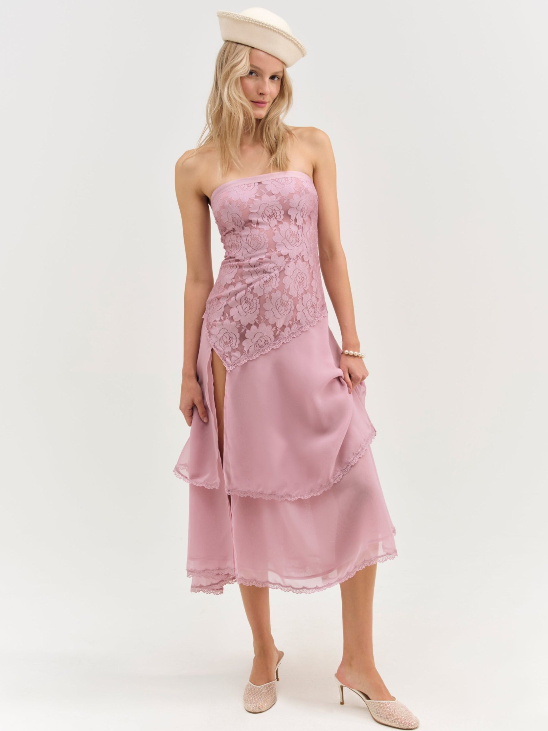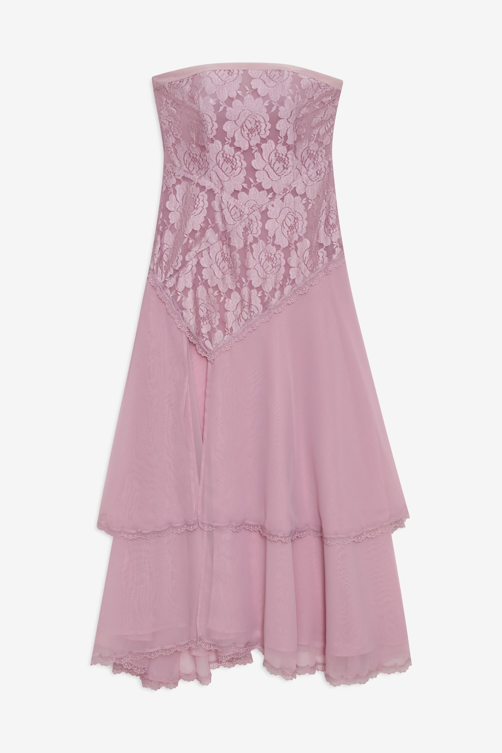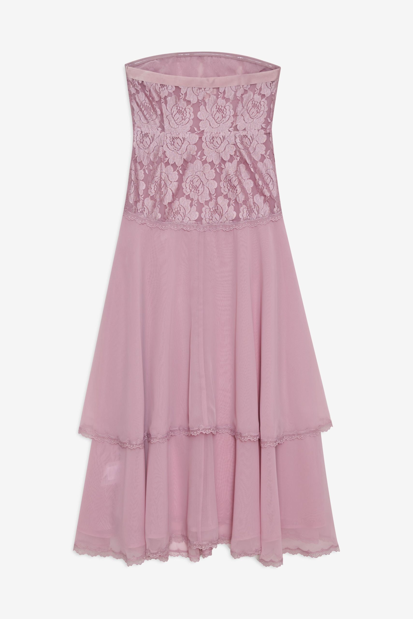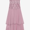Ultra-feminine and hopelessly romantic, the Claudia Rose lace strapless maxi dress has a timelessly chic feel. Crafted in a sweet lace and lightweight chiffon, this pink maxi dress features an asymmetrical drop-waist, a tiered skirt, and a slit at right leg. It’s adorned with a lace trim throughout.