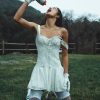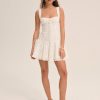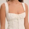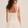 The Daisy Lace drop-waist mini dress is what summer dreams are made of. Crafted in a daisy lattice lace, this little white dress features a gathered bust panel, a boned corset bodice, and a center-front decorative bow.