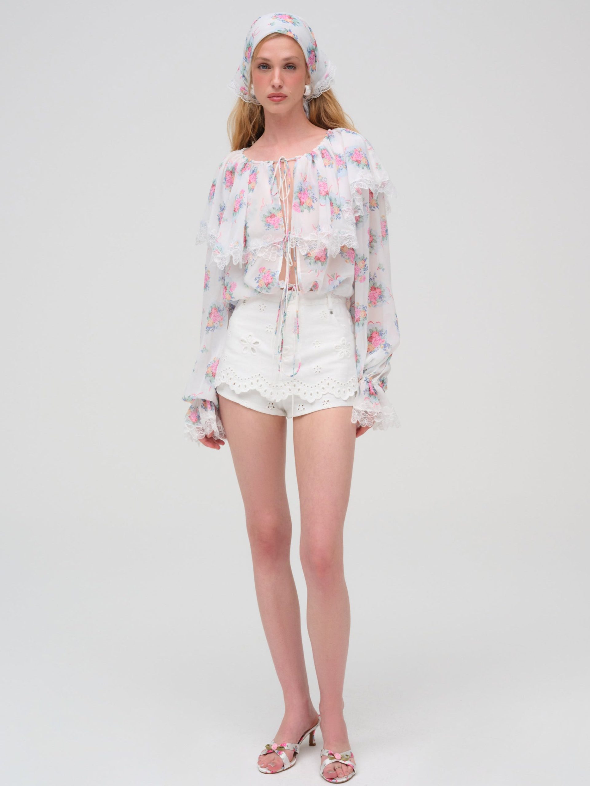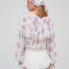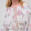 An ode to effortless romance and elegant femininity–the Doily Bouquet long sleeve top is crafted in a sweet floral printed chiffon. Decorated with an ethereal ruffled collar with lace trim, this floral blouse has long elasticized billowy sleeves and functional ties at the center-front for a laid-back, wear-everywhere look.