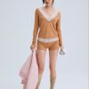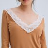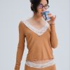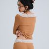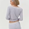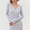 The Eisley blue knit top offers a feminine take on an everyday basic. Crafted in a soft and stretchy rib knit, this long sleeve top has a deep V-neckline trimmed in lace and adorned with a small rosette. It’s finished with lettuce edge detailing along the sleeves and hem. For the full loungewear set, pair with the Eisley Knit Short.