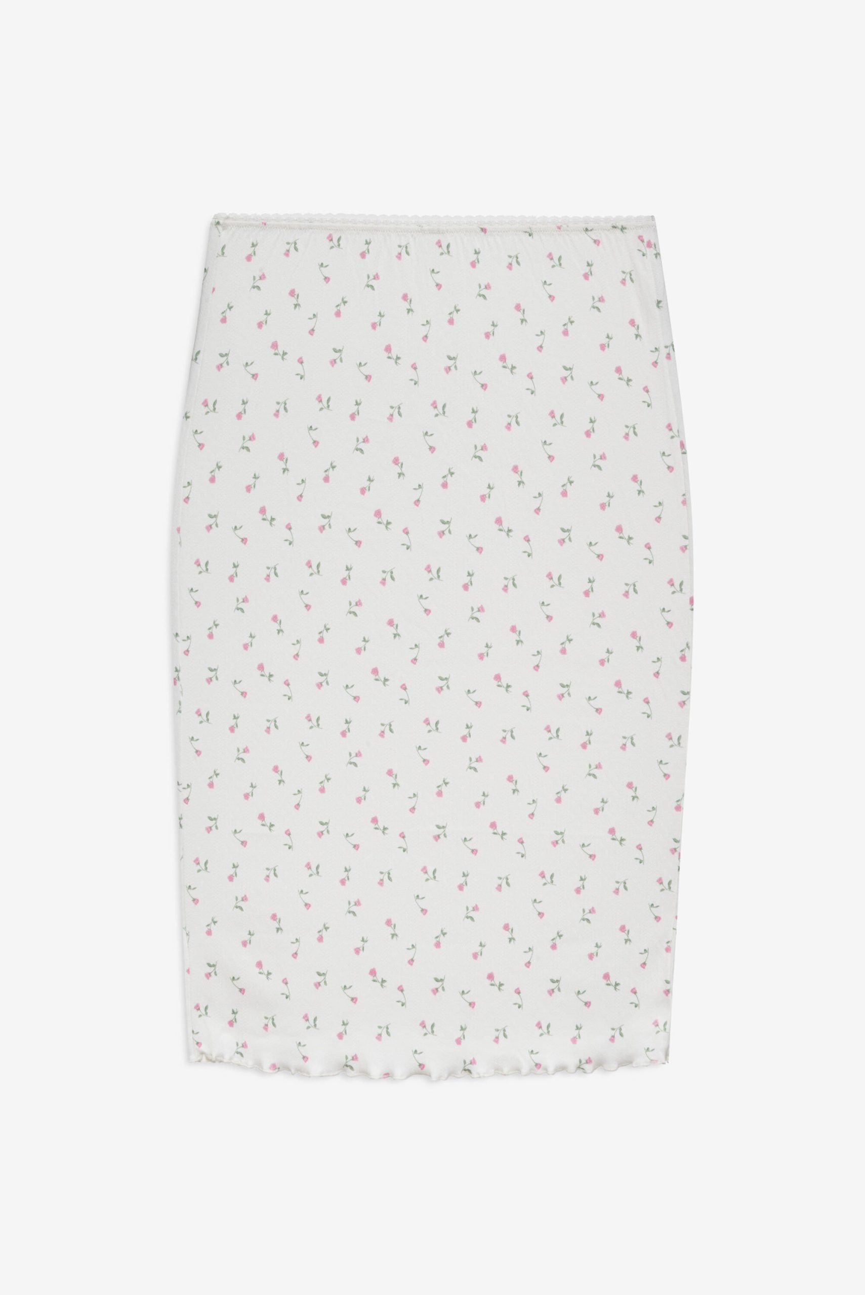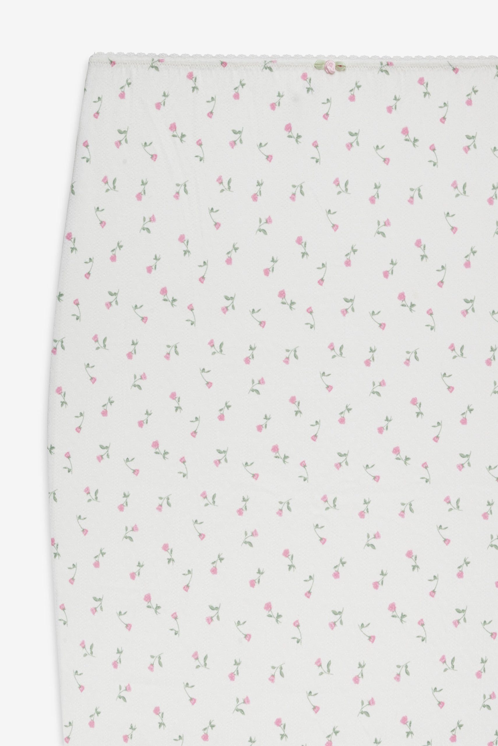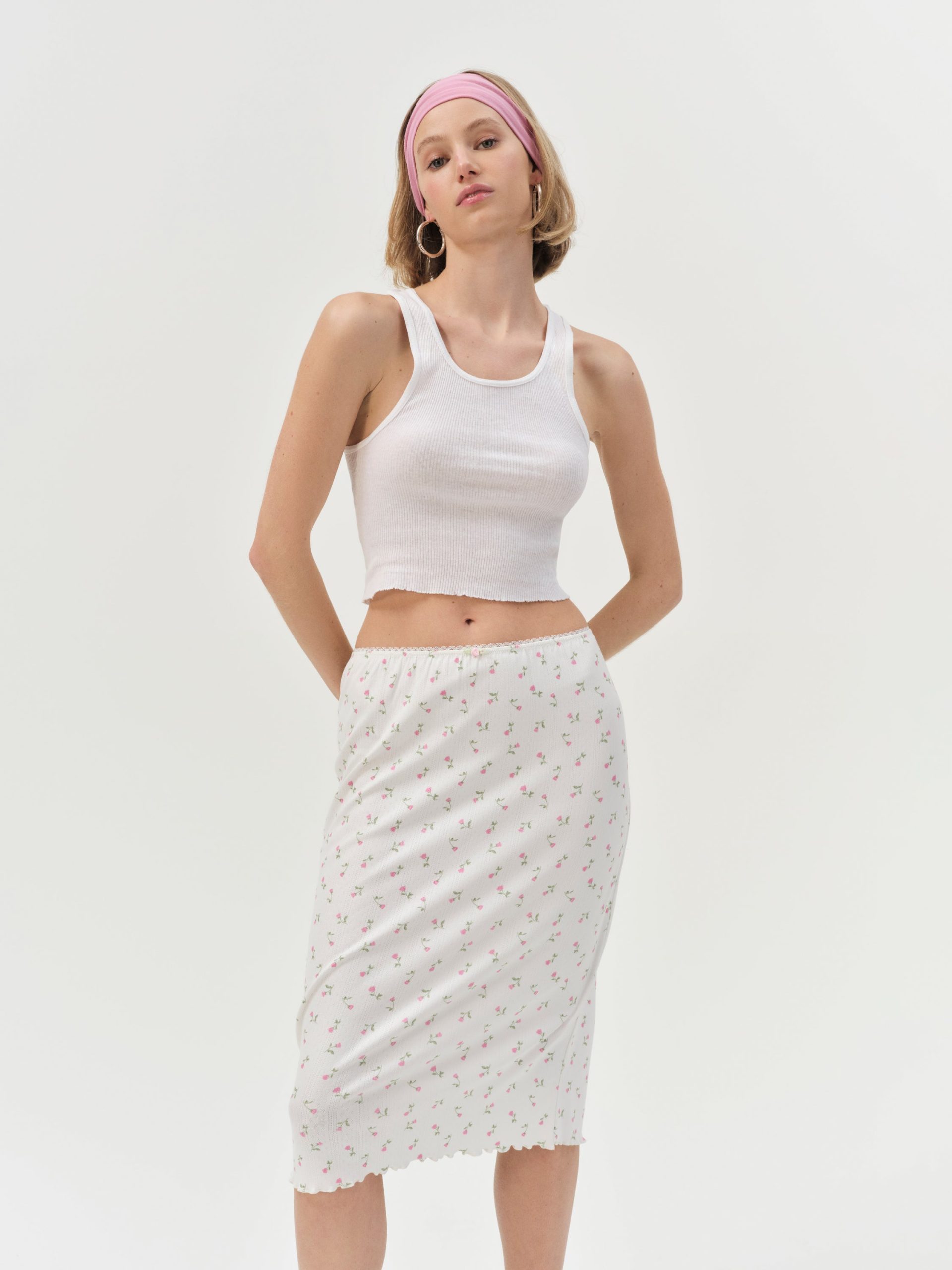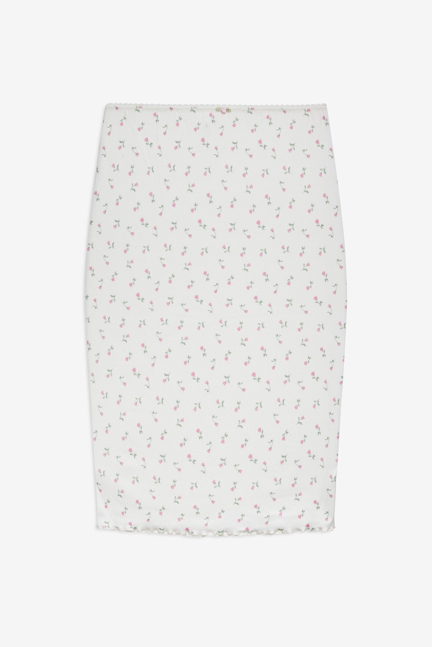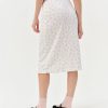 Effortless, pretty, and personal, the Elliana white midi skirt was designed to take you from the bedroom to brunch with total ease. This floral midi skirt spotlights an elasticized waist and is adorned with scallop picot trims, lettuce edge finishings, and a rosette at front waist.