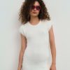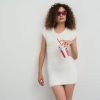 Make a chic, yet feminine statement in the Fuzzy knit mini dress—a white dress adorned with decorative bows at the neck and sleeves. Effortlessly wearable, this fitted, cap sleeve short knit dress captures the charming and sweet spirit of spring,