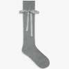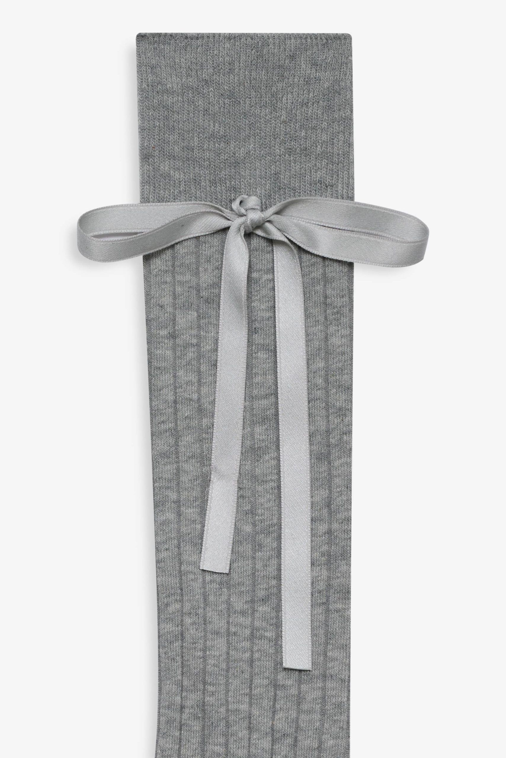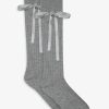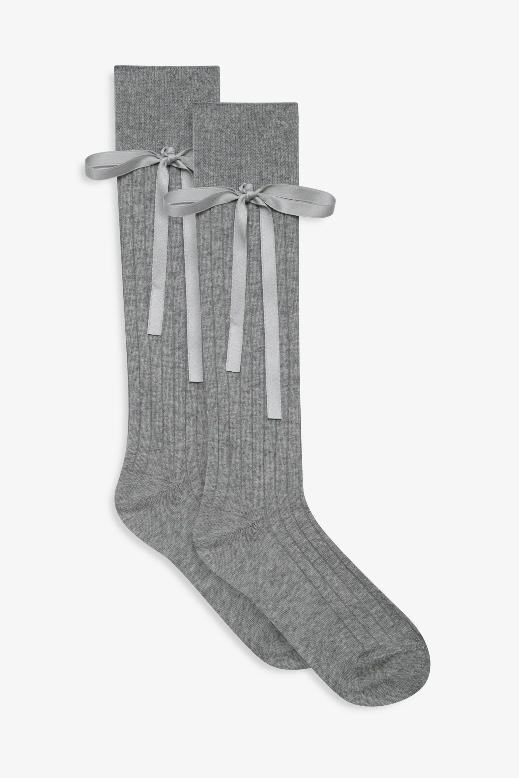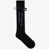 These knee high black socks are crafted with a stretch knit, and adorned with a bow appliqué.