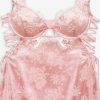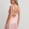 For a fresh take on nostalgic romance, the Le Fleur pink slip dress exudes pure elegance with its floral jacquard fabrication and lace trims. This pink mini dress features underwire cups, flirty cut-outs, a low open back, and bow straps.