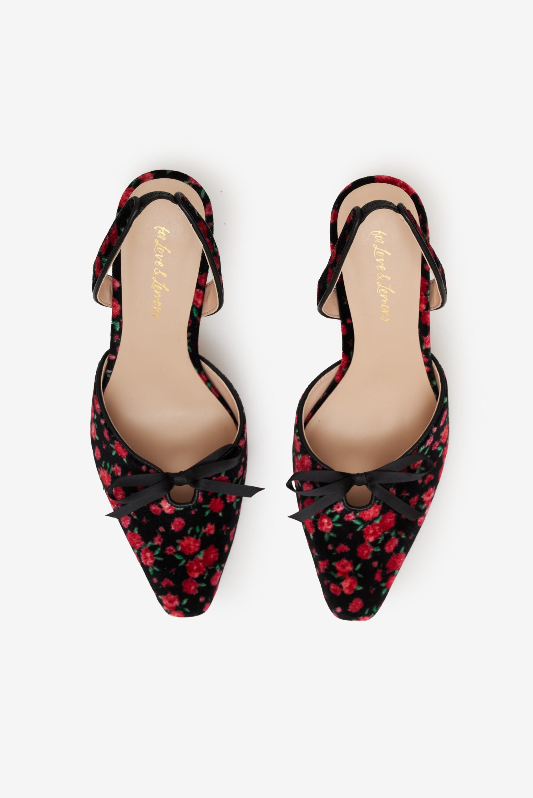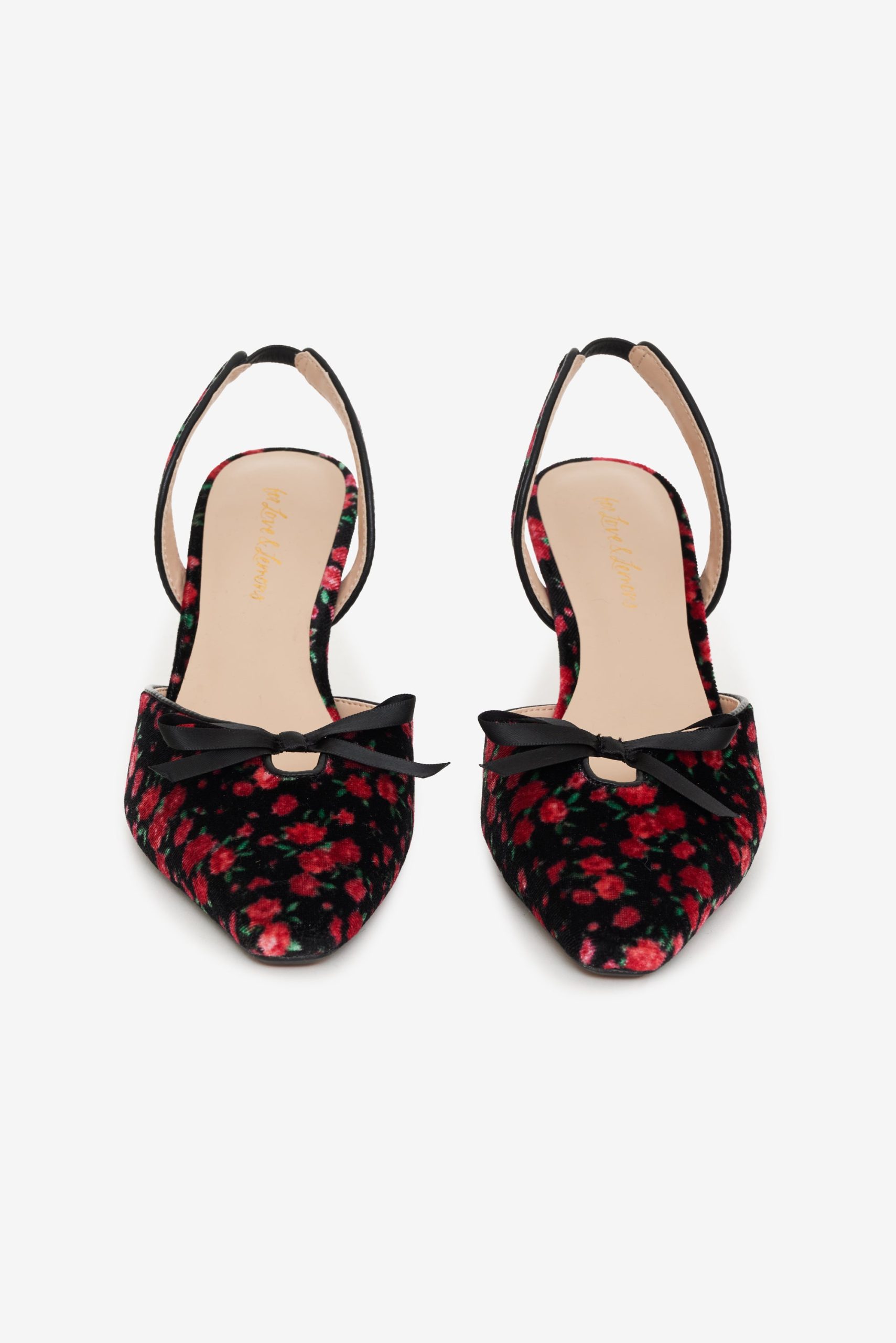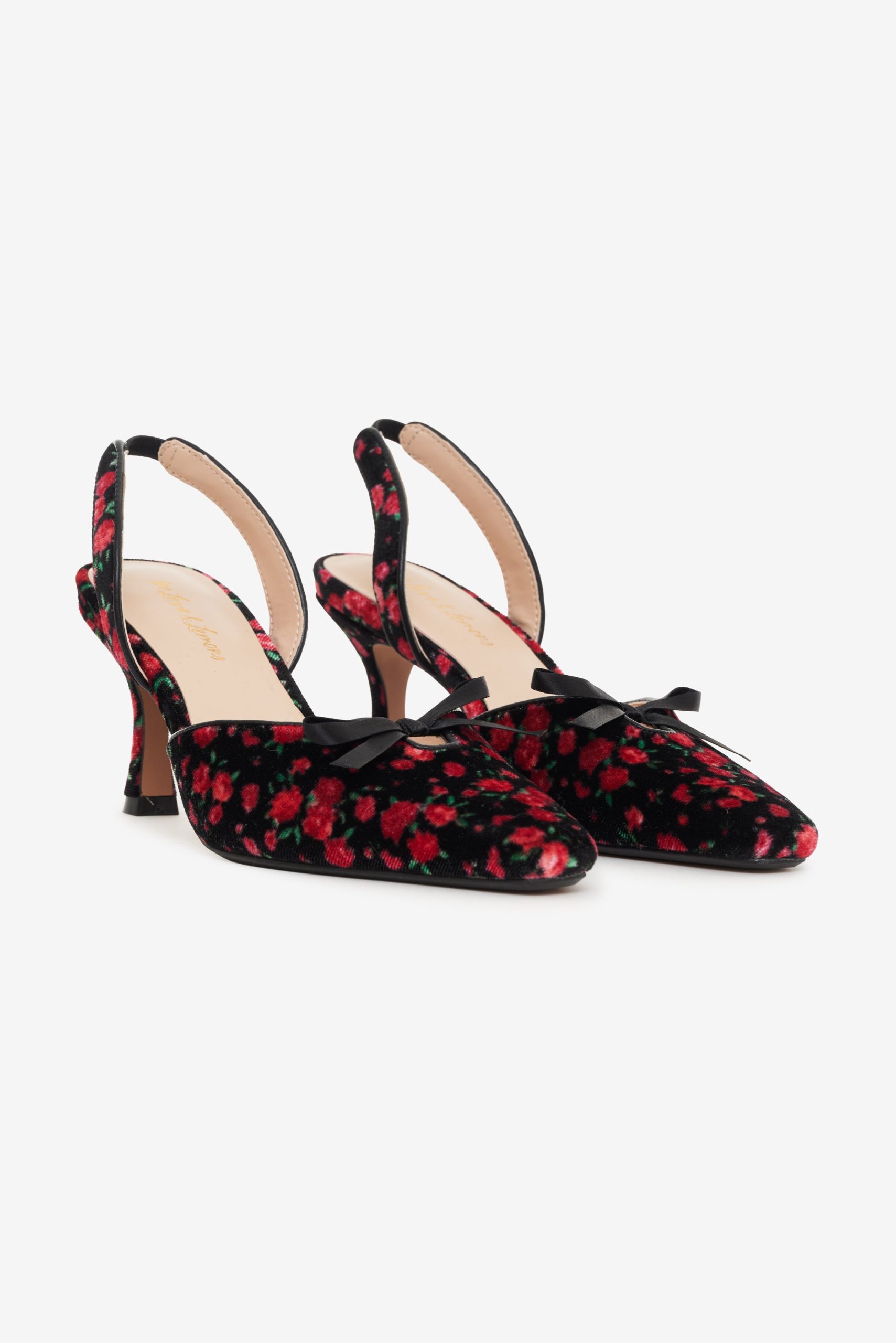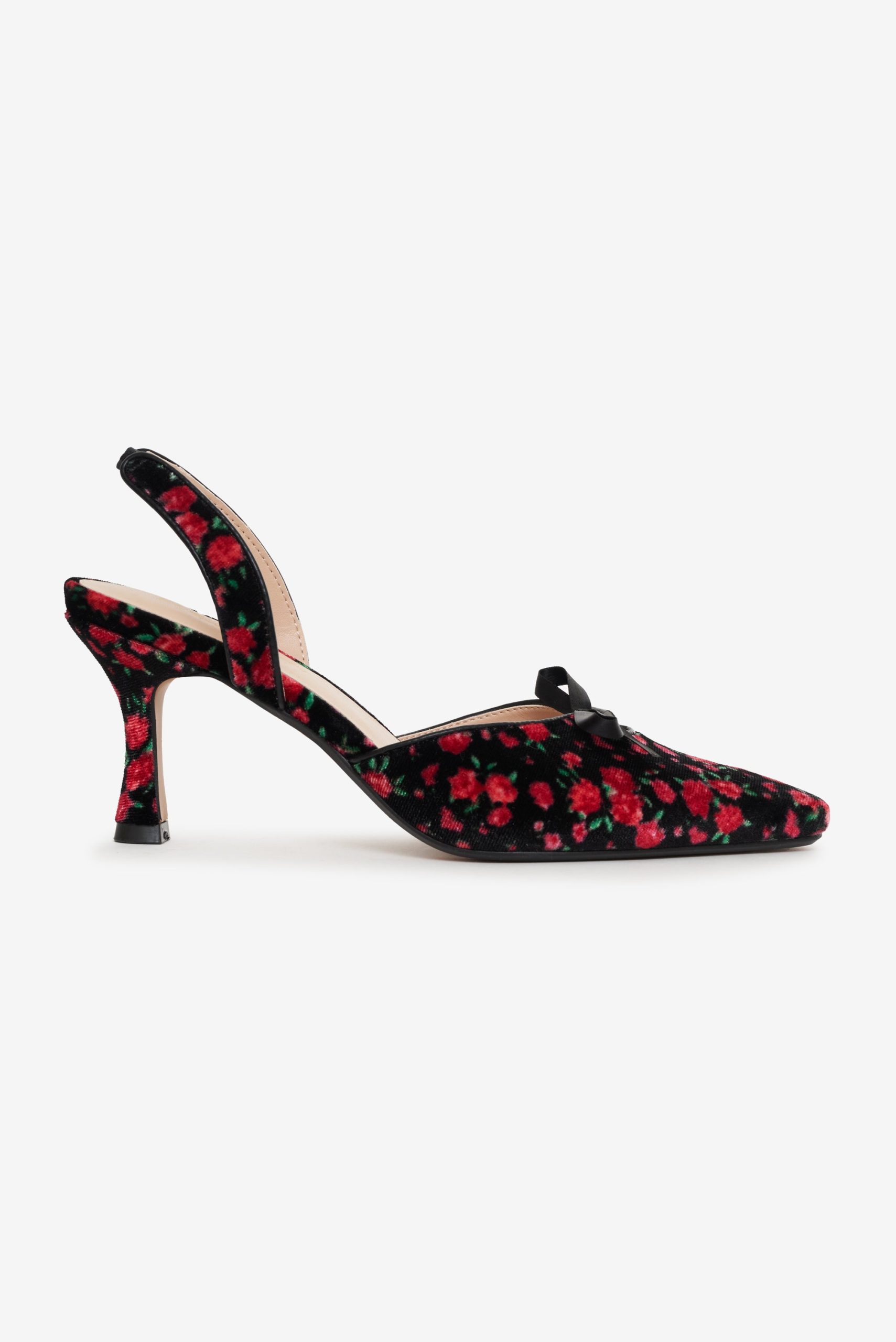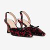 The perfect pair of party shoes, the Lyanna slingback heel invites you to embrace your romantic side with its allover ditsy floral-printed velvet. This floral shoe is finished with a single black bow.