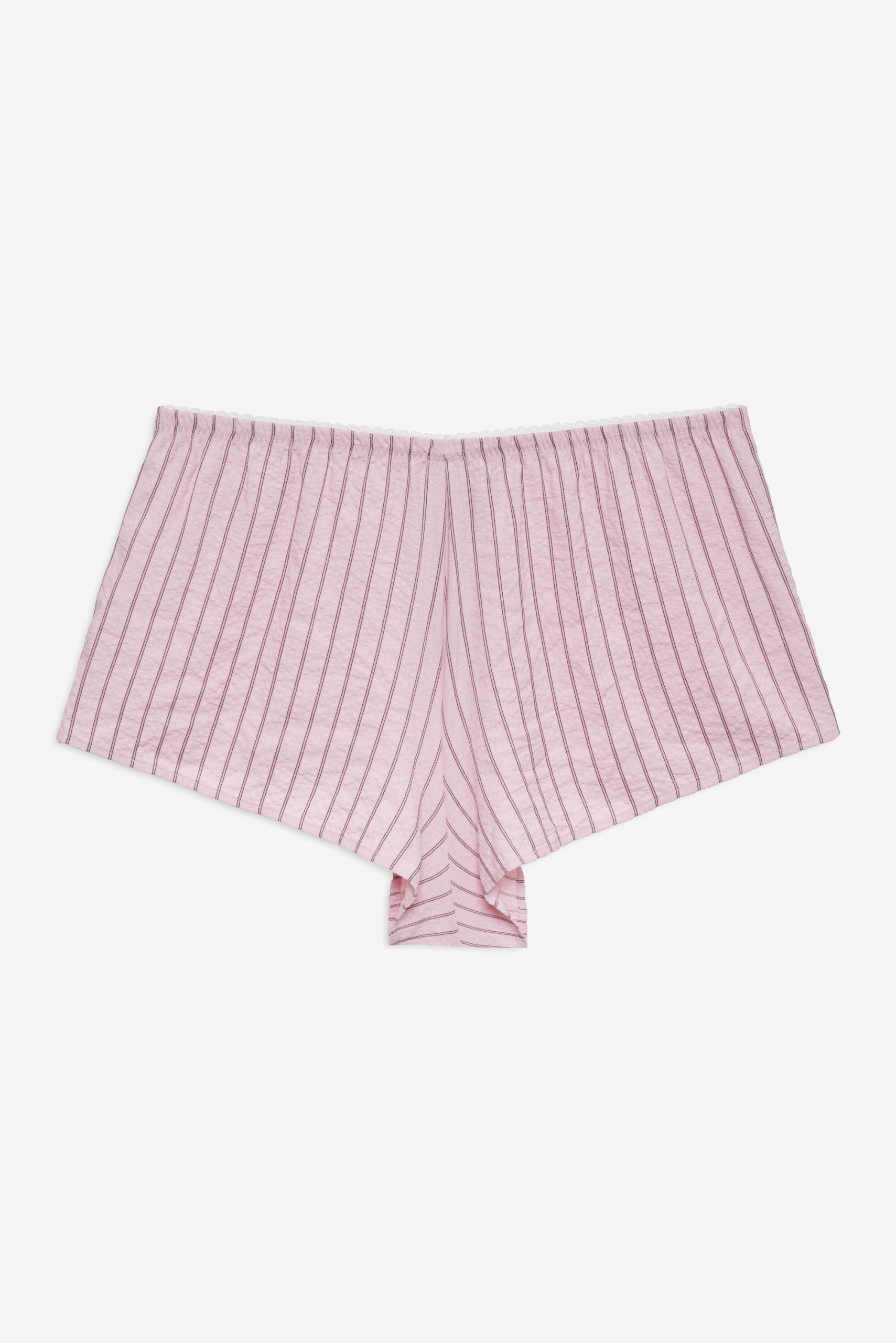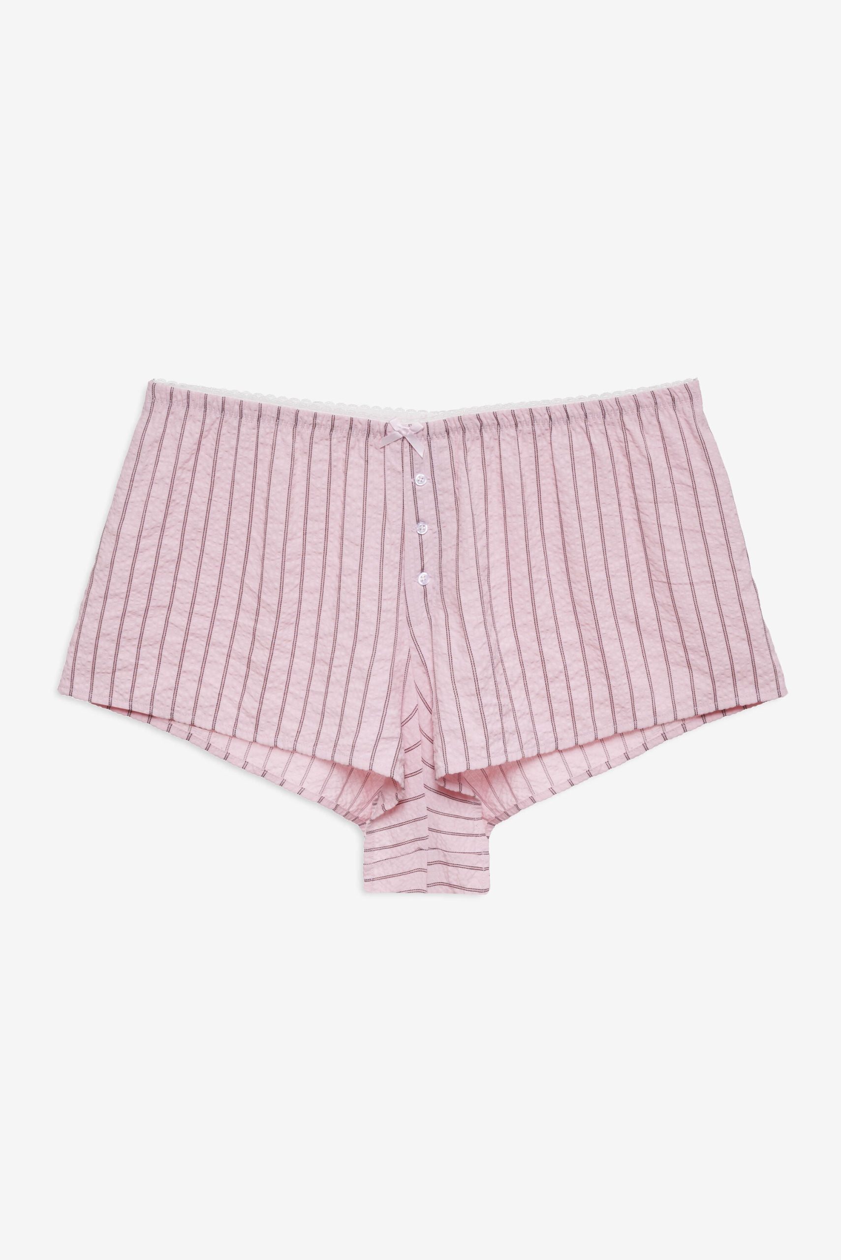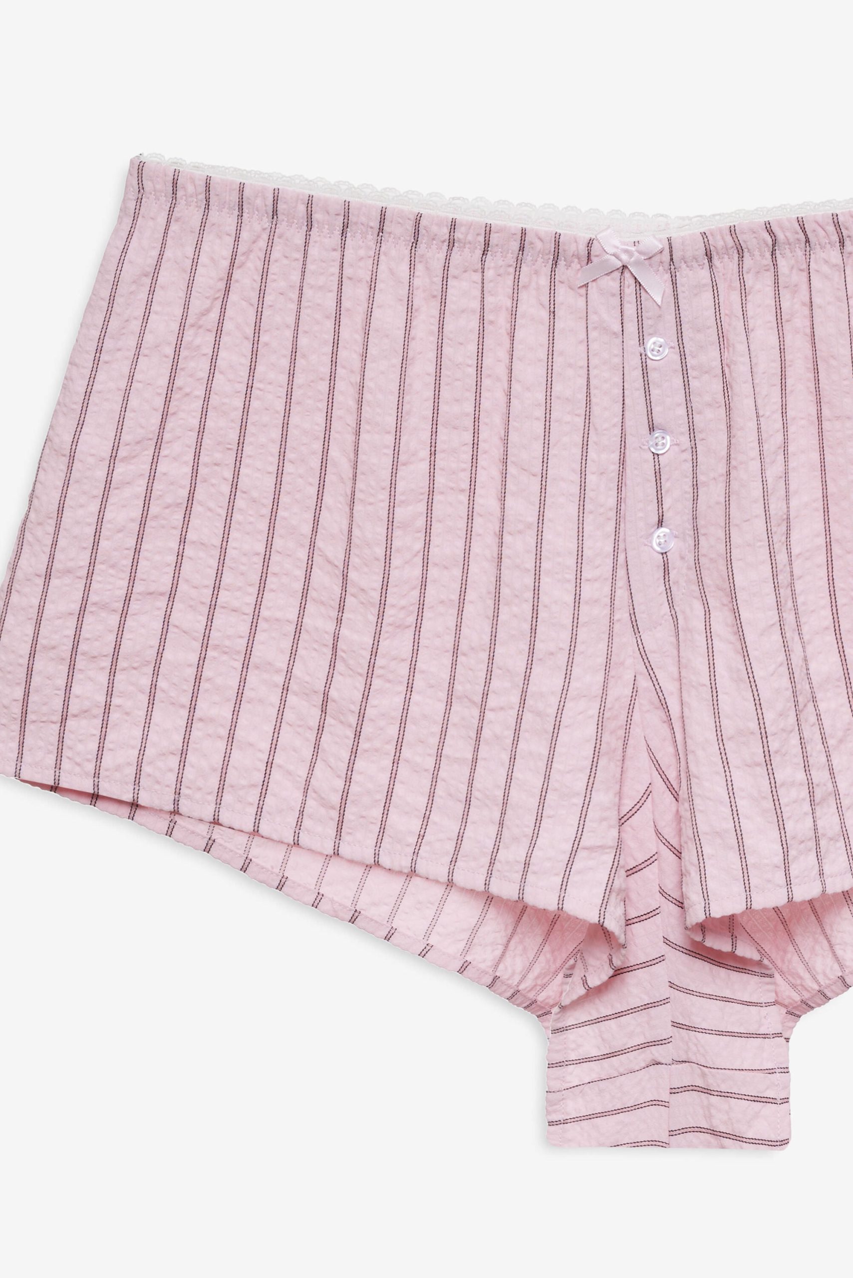 For the cutest stay-at-home uniform, the Mindy striped boxer shorts make for an effortlessly chic look. Crafted in a classic seersucker stripe, these pink boxer shorts spotlight a front boxer placket with buttons and are adorned with picot trims and decorative bow at front waist. Pair with the Mindy Stripped Button-Down Shirt for the complete pajama set.