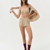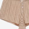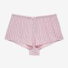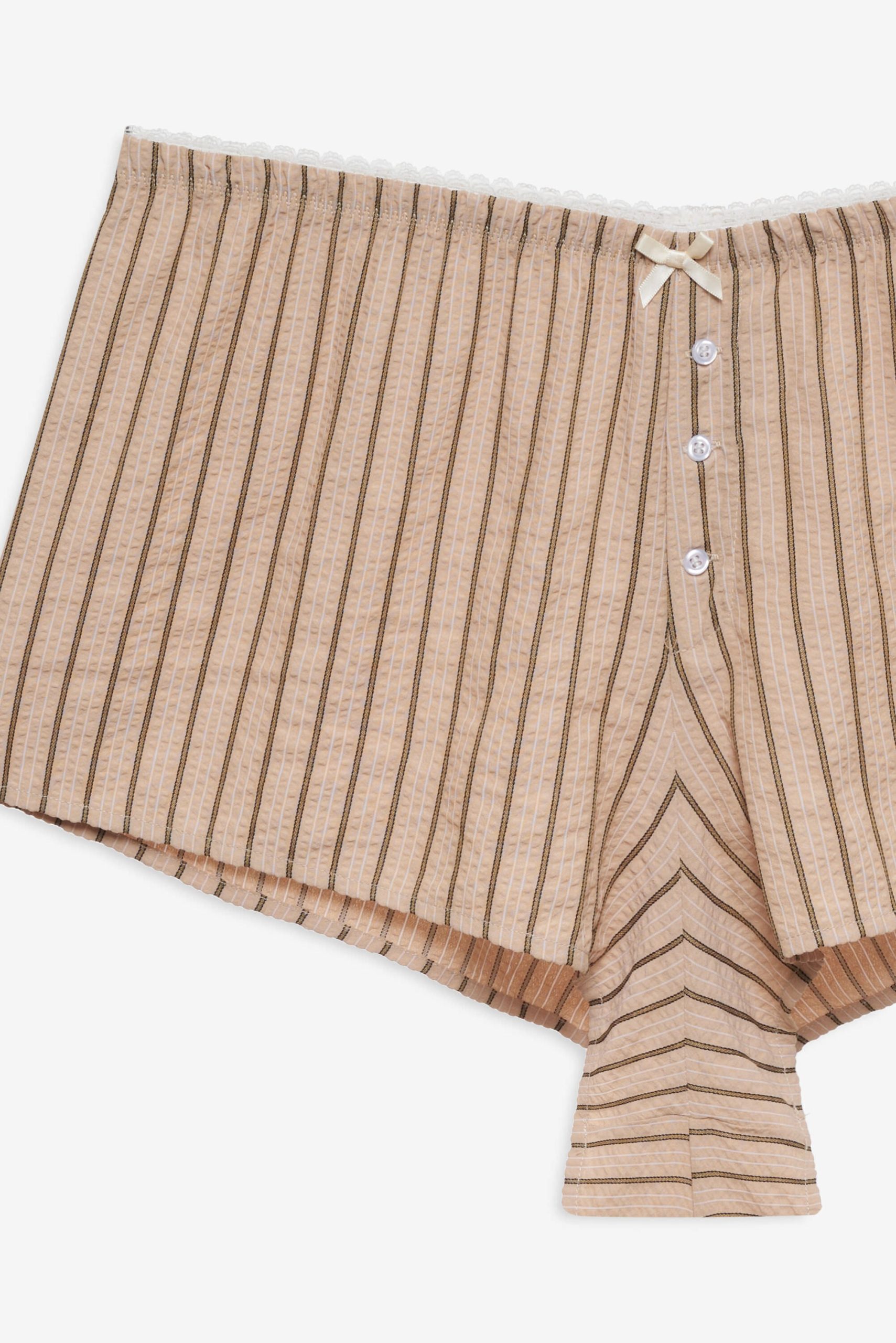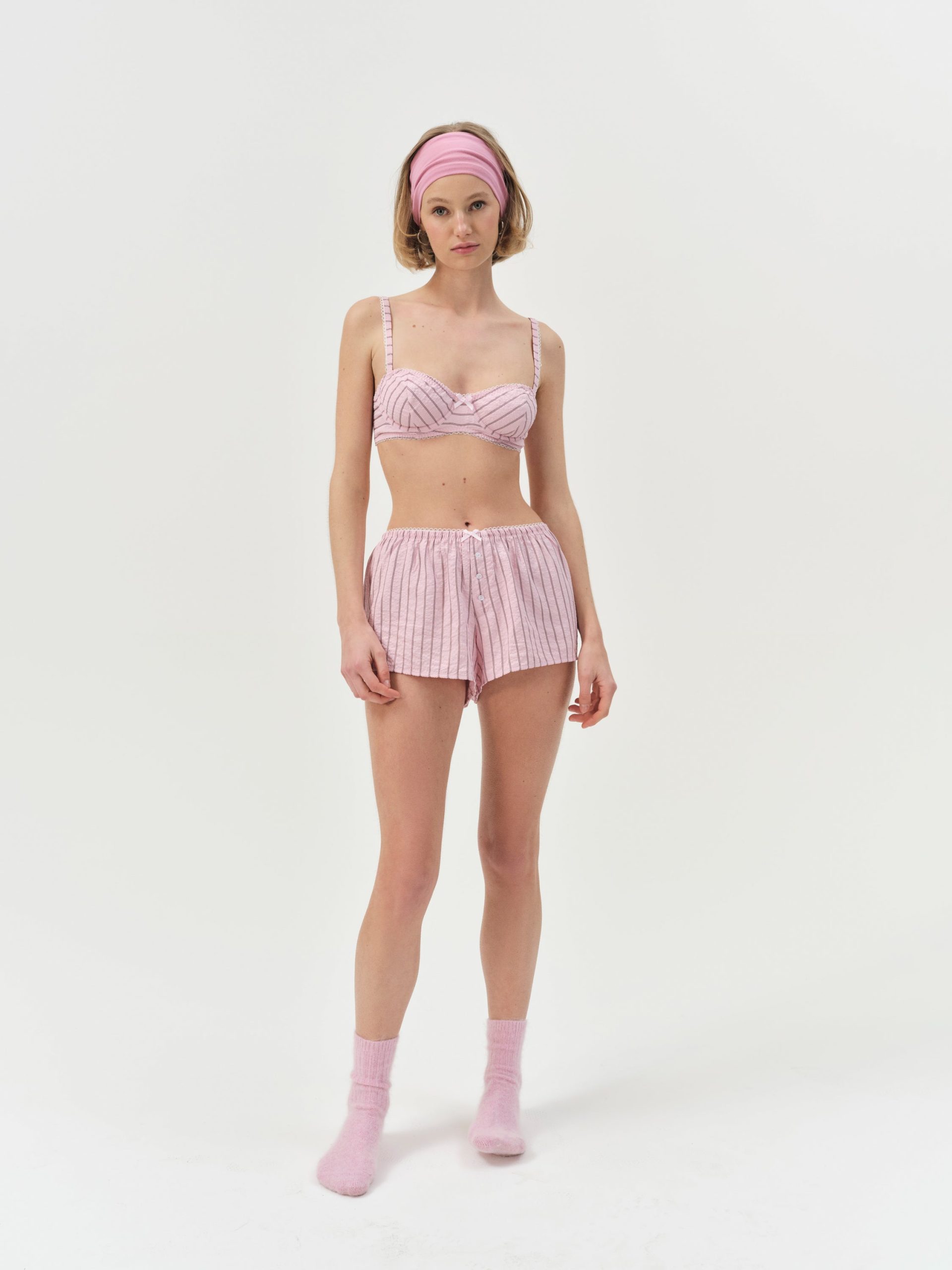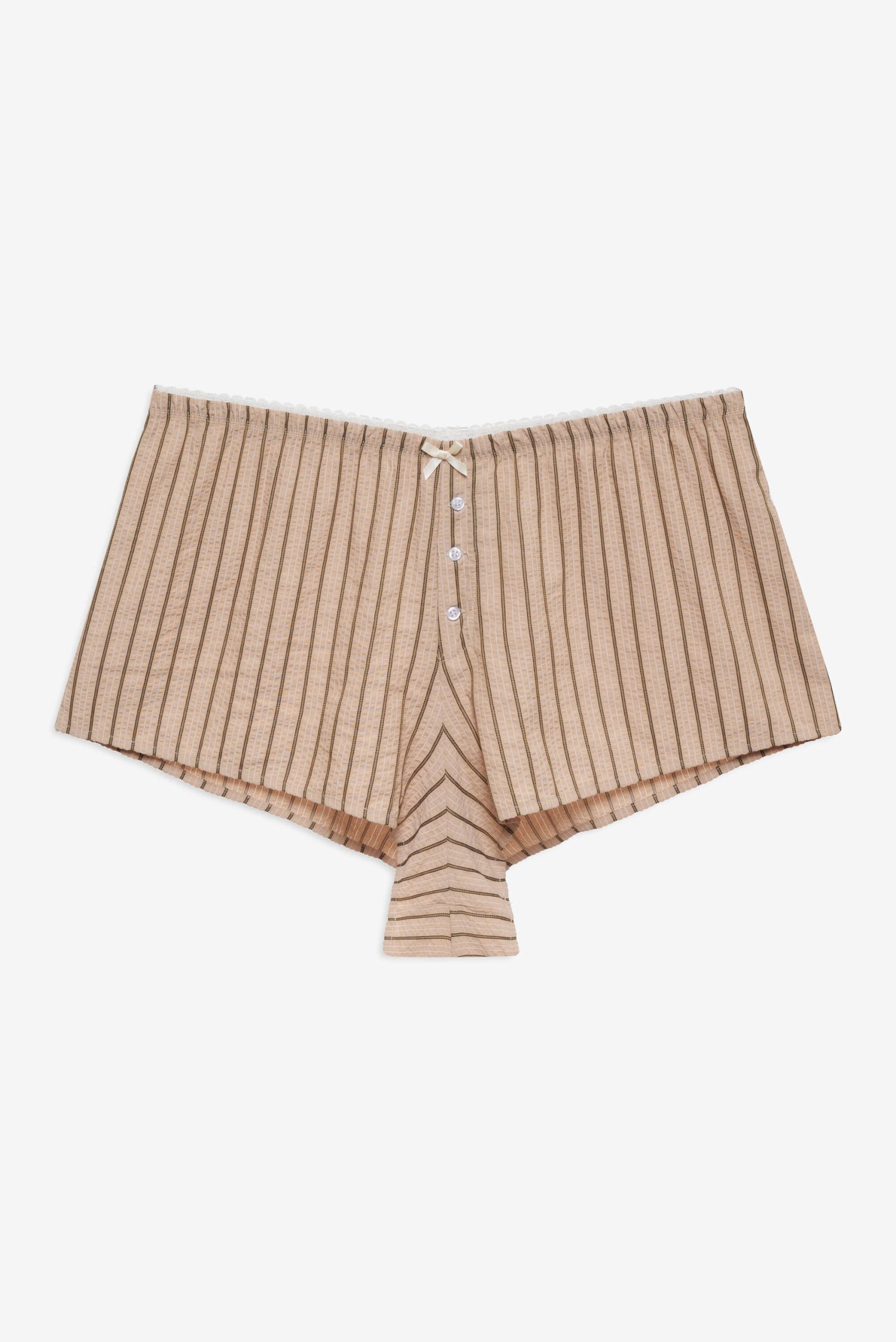 For the cutest stay-at-home uniform, the Mindy striped boxer shorts make for an effortlessly chic look. Crafted in a classic seersucker stripe, these pink boxer shorts spotlight a front boxer placket with buttons and are adorned with picot trims and decorative bow at front waist. Pair with the Mindy Stripped Button-Down Shirt for the complete pajama set.
