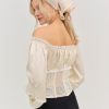 A playful nod to a timeless aesthetic, the Paulina patchwork off the shoulder long sleeve top charms with its vintage-inspired mixed fabric panels. This corset top features a boned bodice with lace ruffle details and a functional drawstring at the neckline.