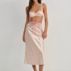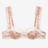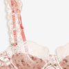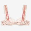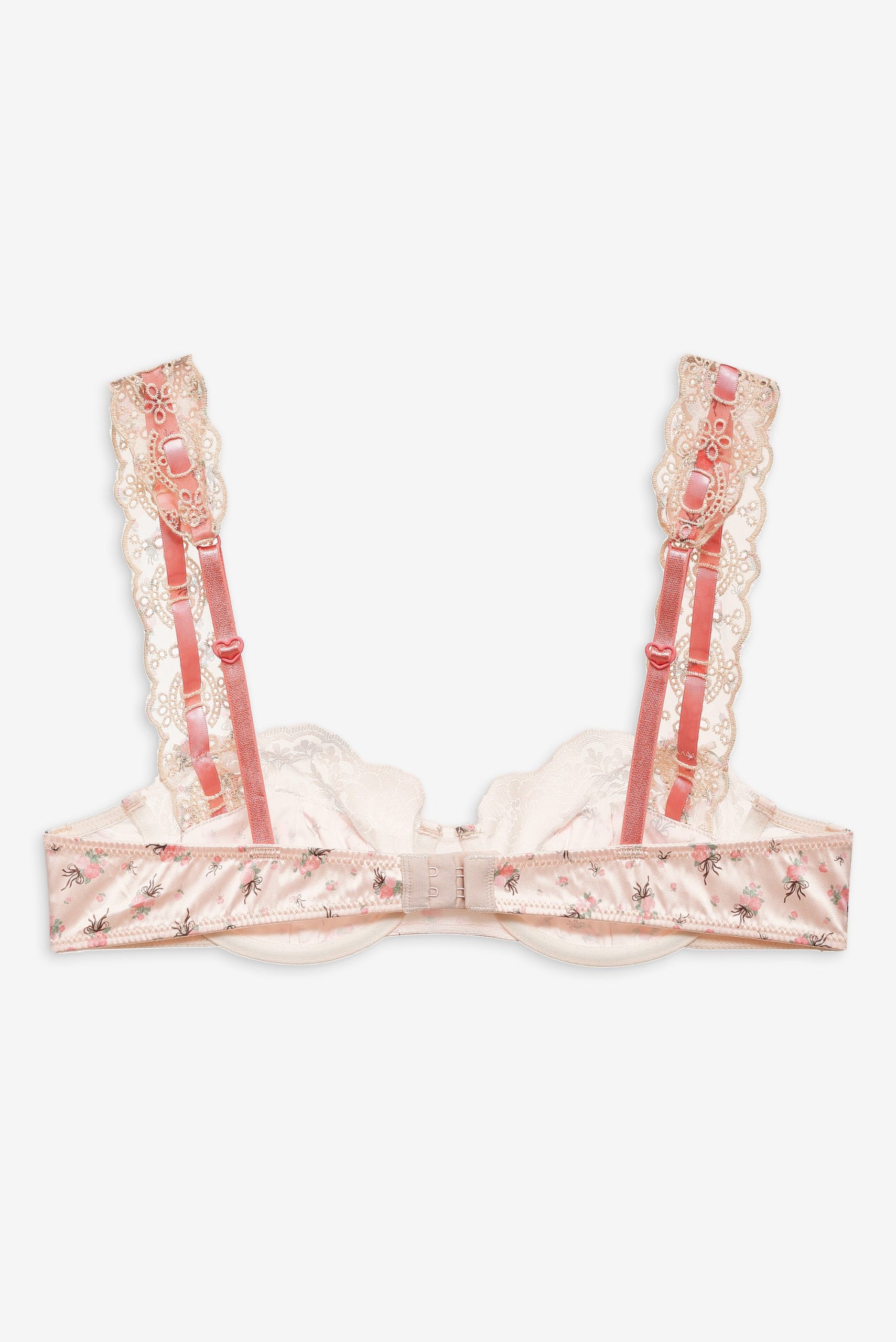 Blurring the lines between lingerie and daywear, the Peaches & Cream satin bra is made to be worn in and out. Crafted in a vintage-inspired floral print, this underwire bra is adorned with wide slotted ribbon organza eyelet lace trims and a rosette topped satin bow at center-front.