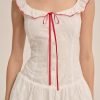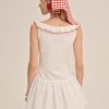 Go berry picking in the charming Strawberry Jam white mini dress—a drop waist dress crafted in a 100% cotton strawberry-patterned eyelet. Featuring a ruffled scoop neckline with a contrast red scallop trim and center-front bow, this white dress exudes summertime charm.
