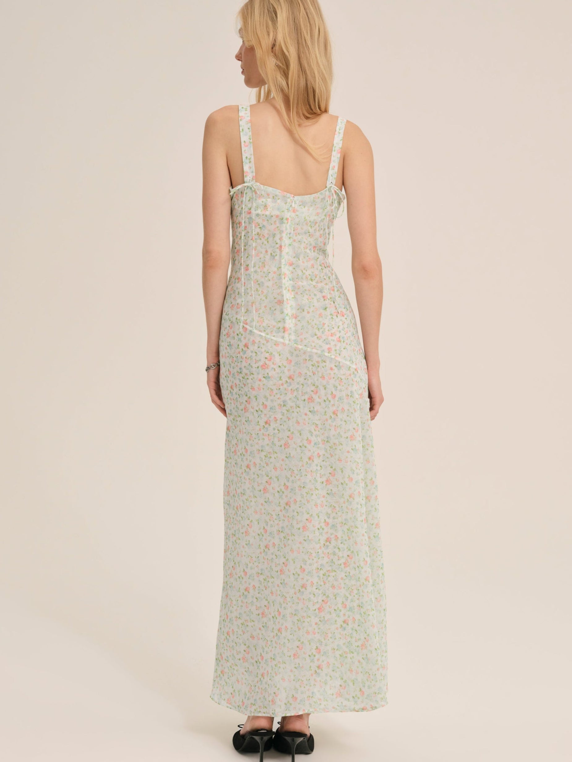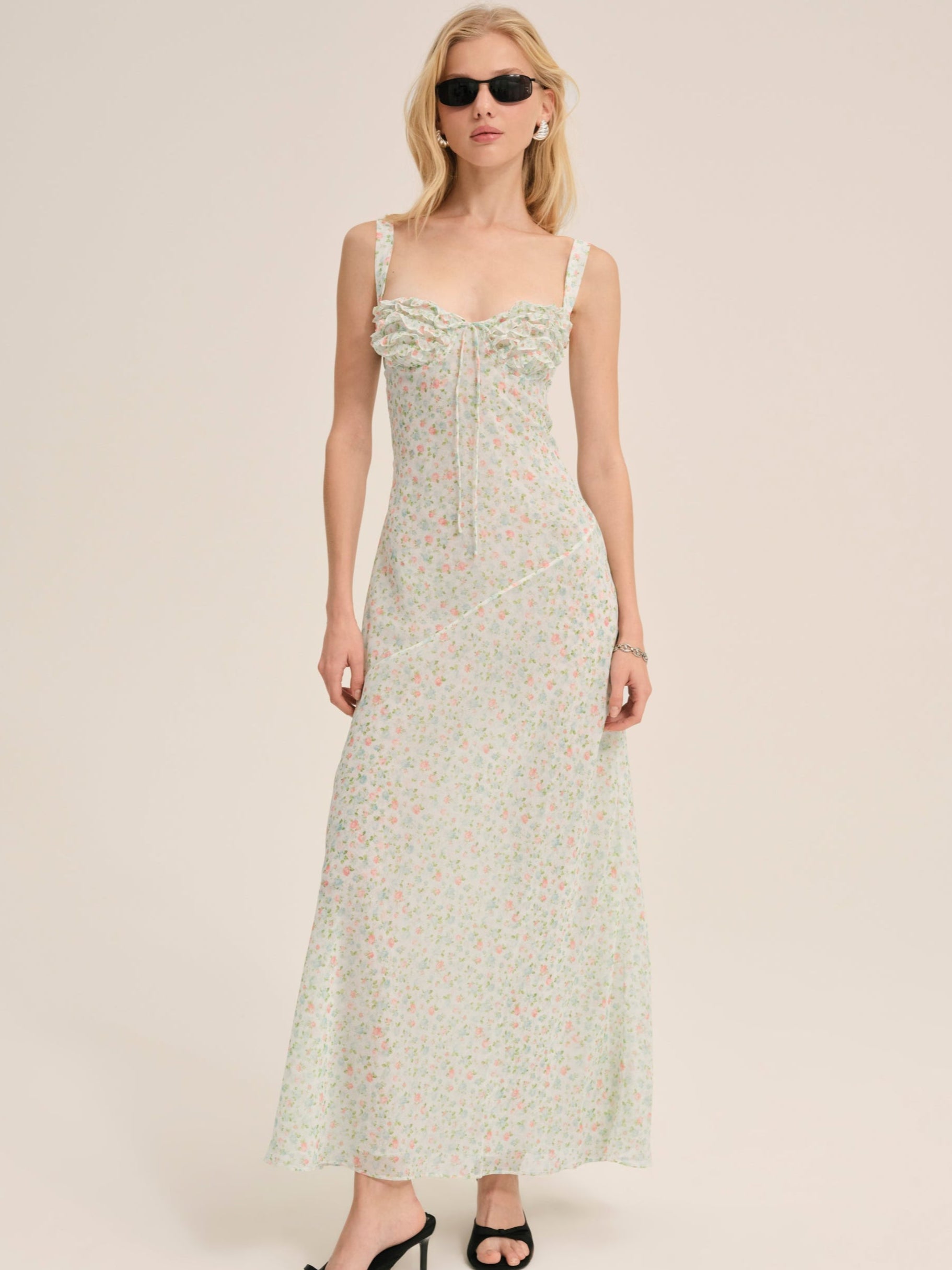 The perfect floral maxi dress for summers by the water—the Summer Breeze blue long dress is cut on the bias for a flattering fit. It features feminine ruffles at the cups.