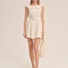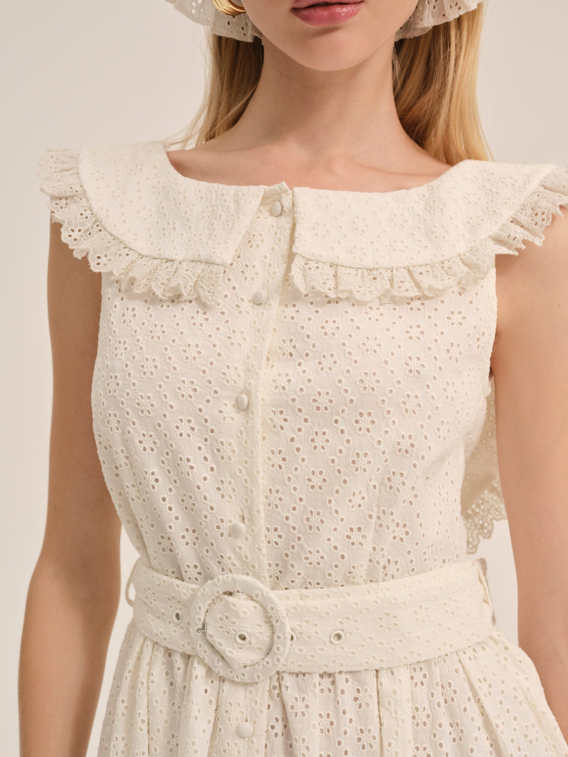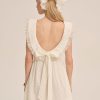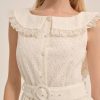 Feel ultra-chic on the picnic blanket with the Tea Time white mini dress—crafted in a 100% cotton eyelet, this high neck little white dress features a functional center-front placket and removable belt, and is adorned with ruffled lace trims and a dramatic fixed bow at center-back.