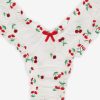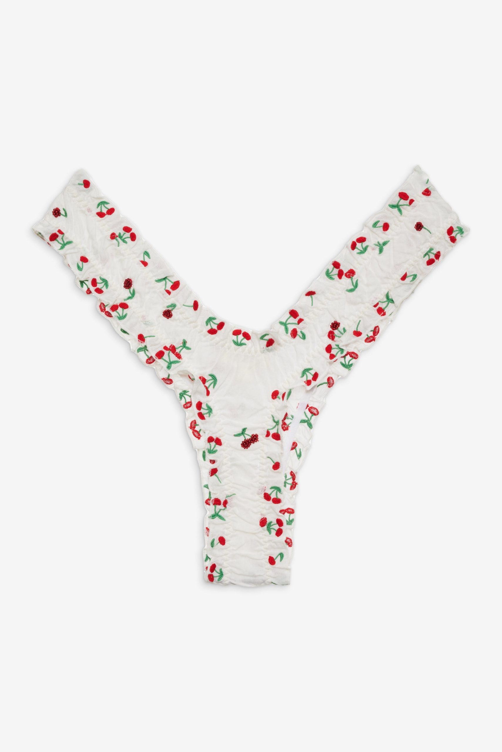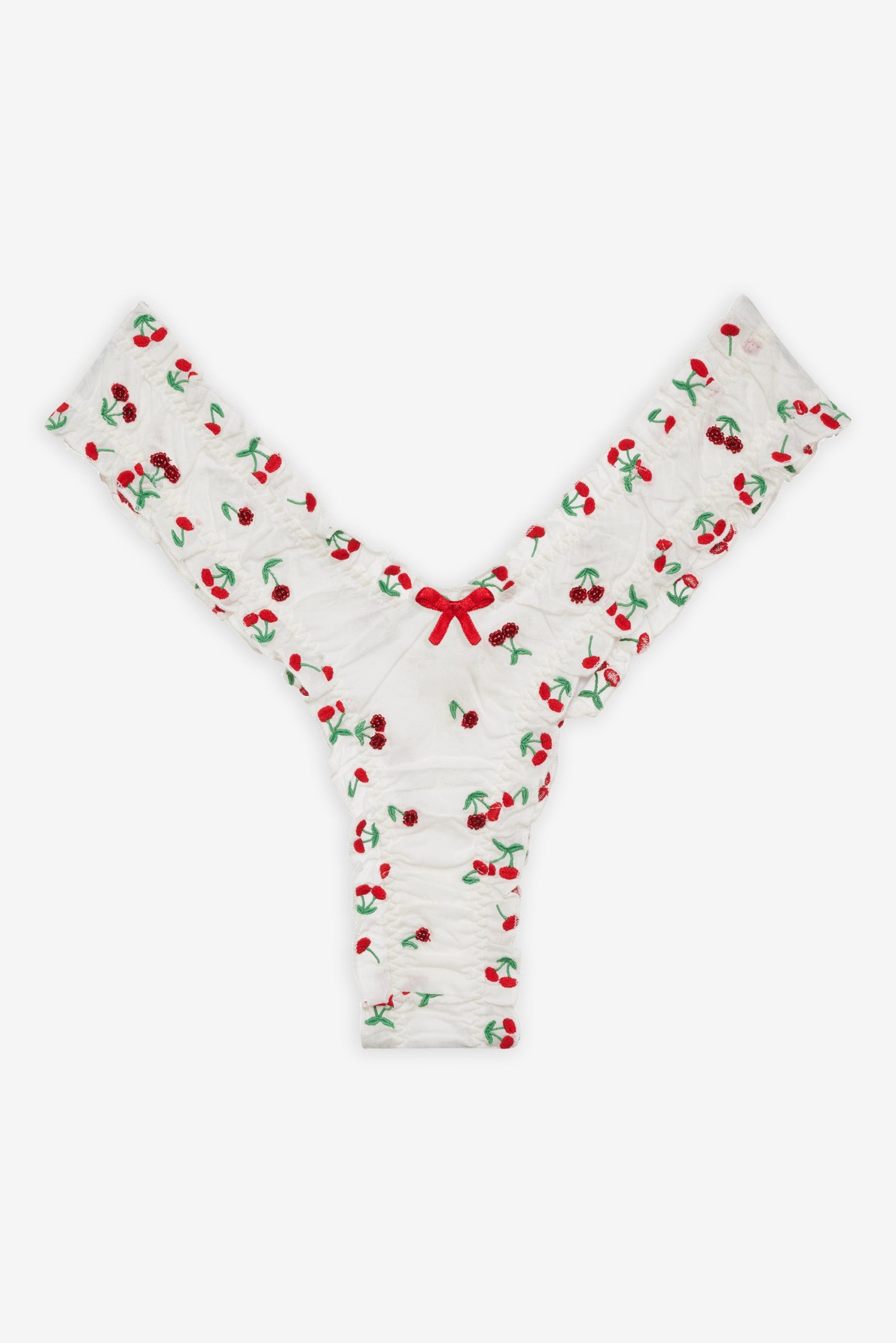 Celebrate love, beauty, and over-the-top romance with the Beaded Cherries thong panty. Crafted in a crisp white cotton, this vintage-inspired white thong is adorned with beaded cherries, ruffles at the edges, and a sweet satin bow appliqué.