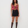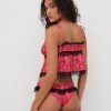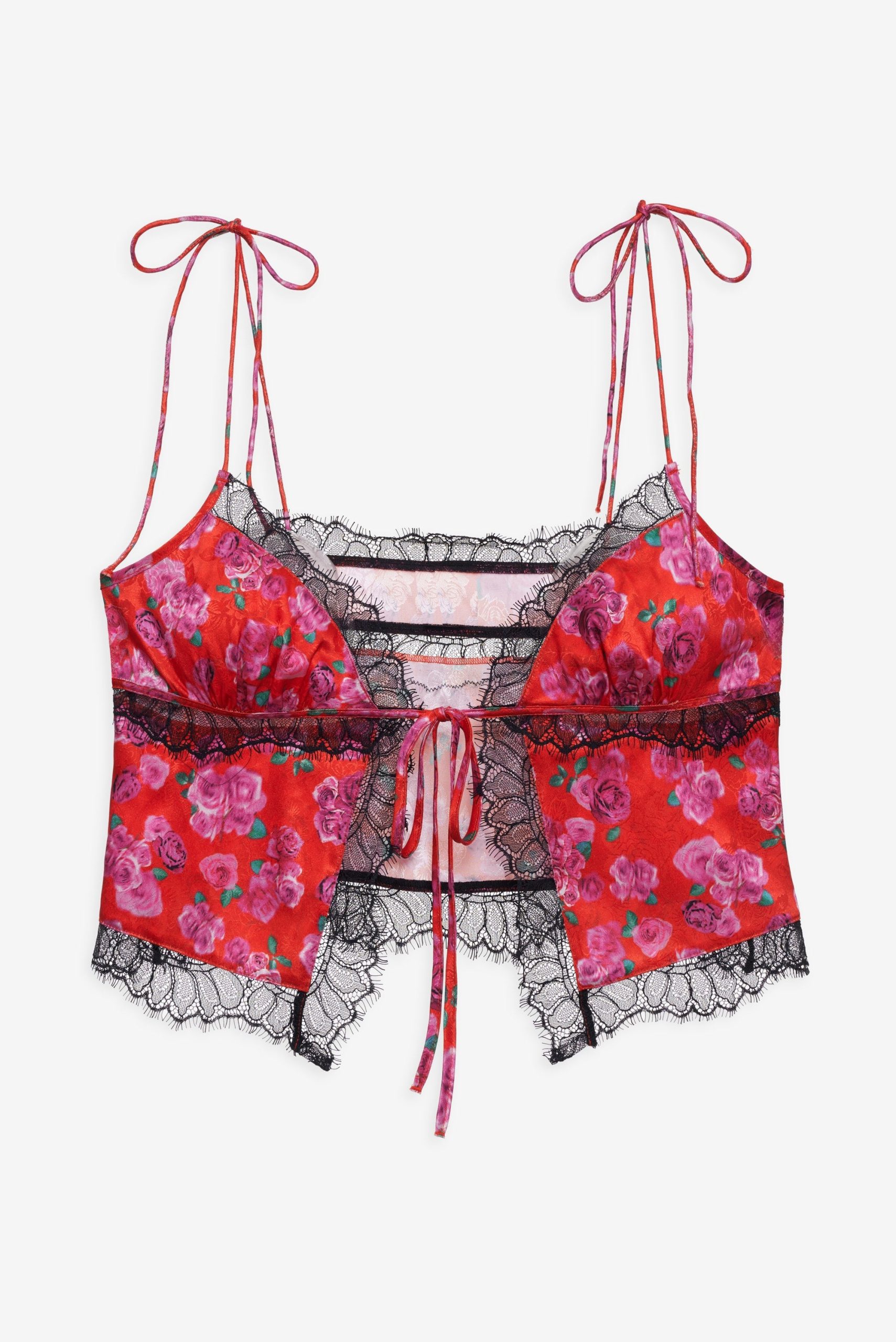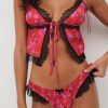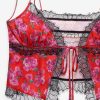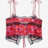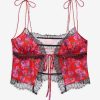 The Bellamy red pajama top exudes romance. Crafted in a rose-printed jacquard, this open-front camisole has lace trims throughout, and a functional tie at the center-front. It comes with a matching sleep mask for the sweetest slumber.