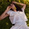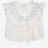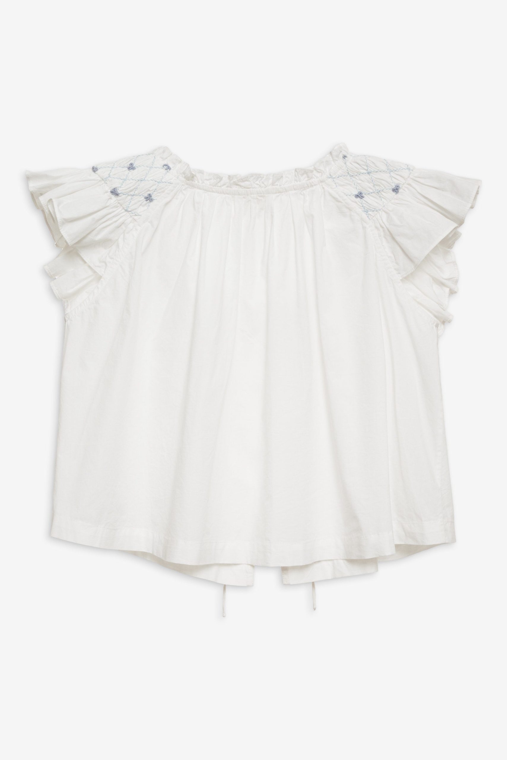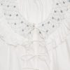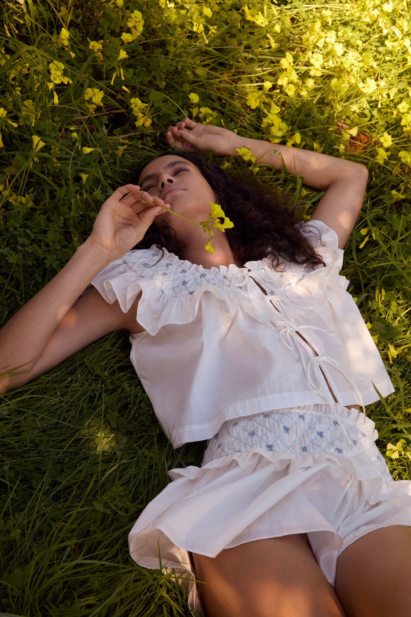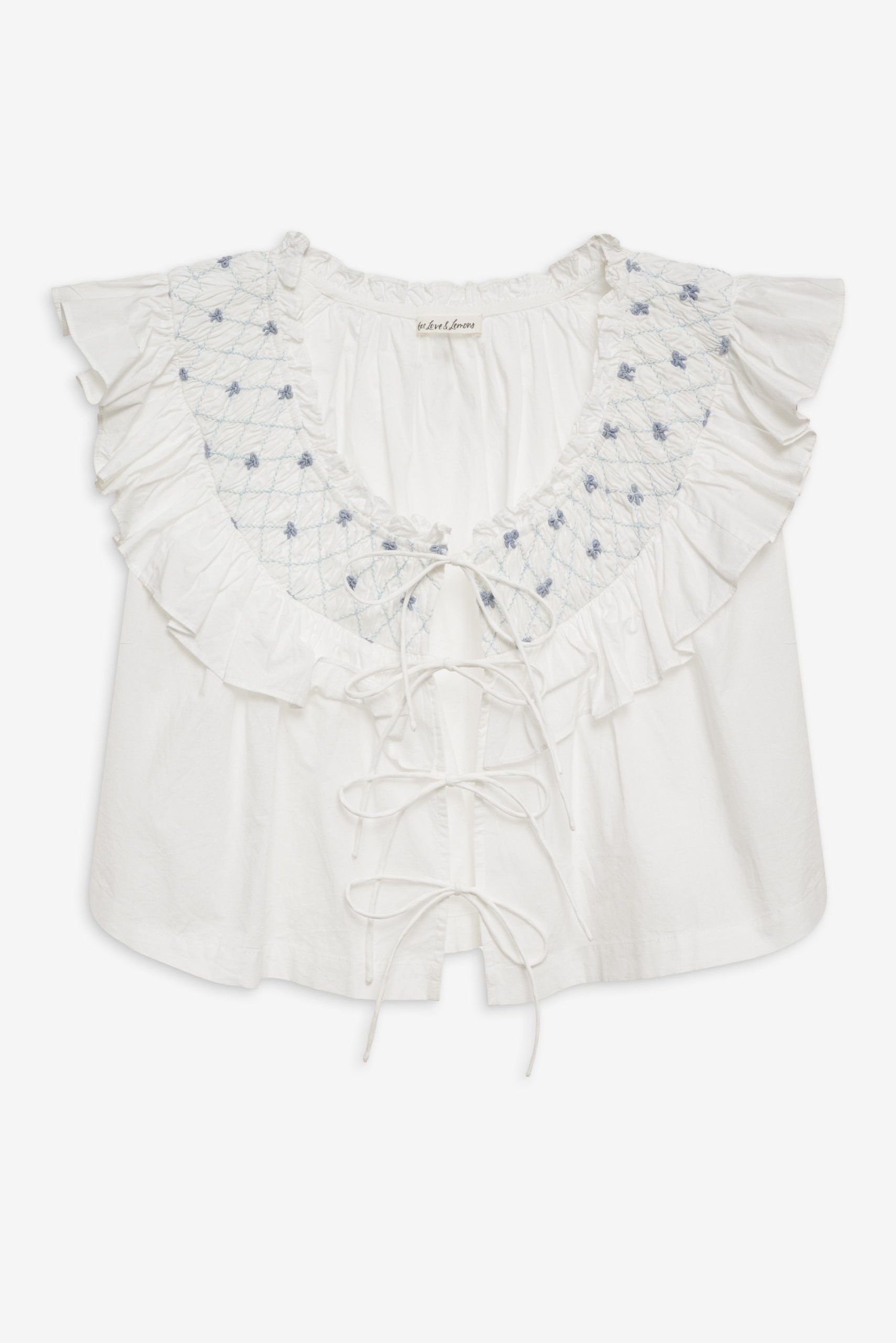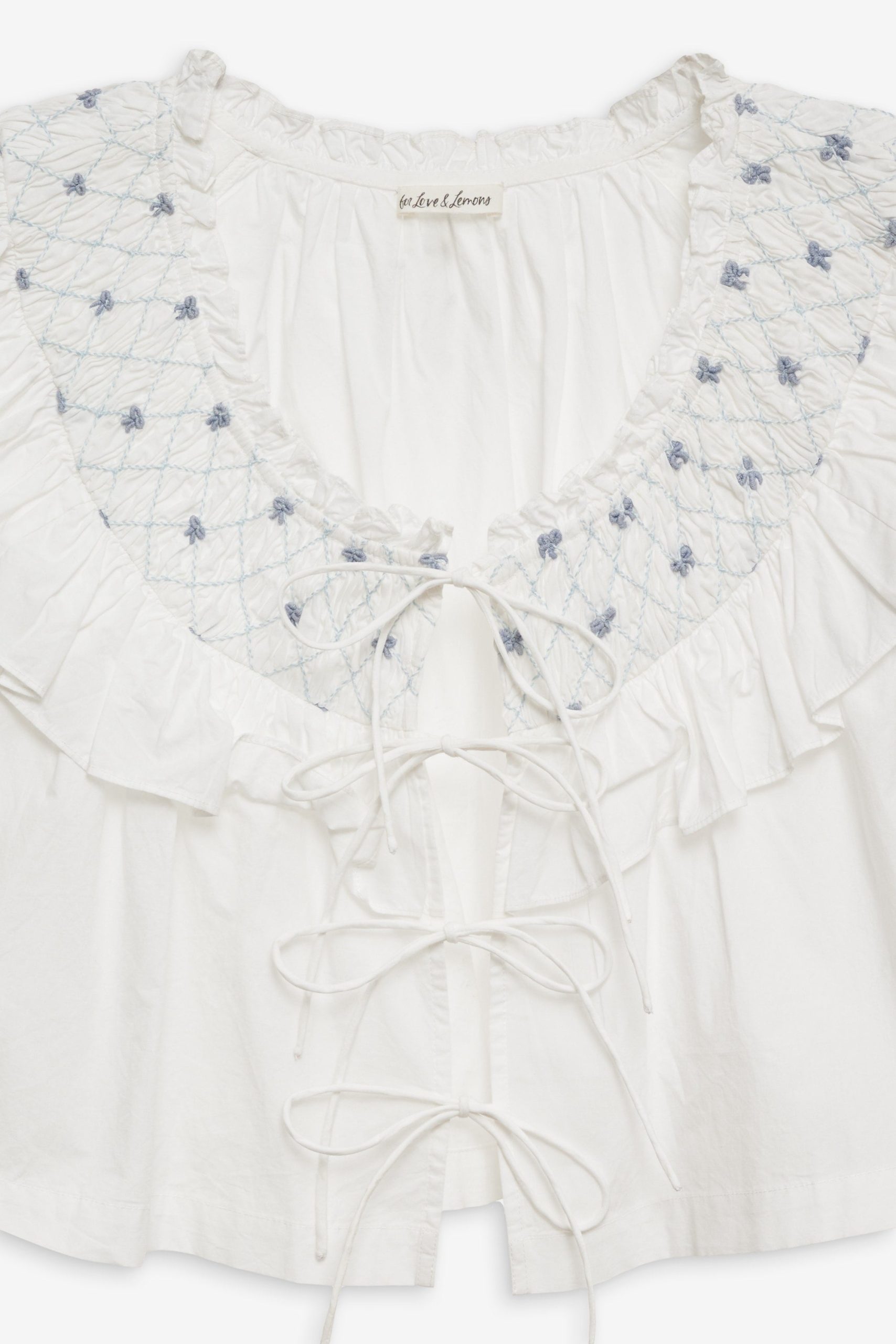 Made for barefoot walks, the Birdie Bow Smocked open-front blouse exudes effortless beauty. Adorned with dainty blue bow embroidered smocking at neckline and sleeves, this short sleeve white ruffled blouse features a wide neckline with ruffled edges.