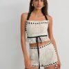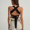 The Charlotte cream lace top is crafted in intricate Sicilian lace—a fabric that’s reminiscent of the sun-drenched linens that dry beneath the Italian sun. Featuring a ruffle peplum, this cropped apron top features contrast black satin ribbons woven throughout.