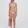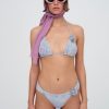 For lovers of florals, the Collina blue and pink bikini top keeps things whimsical poolside. This triangle bikini top is crafted in a shimmering glitter knit that catches the sunlight. It features an allover floral print and is finished with a decorative rosette at the left strap. Pair it with the Collina bikini bottom for the full swim set.