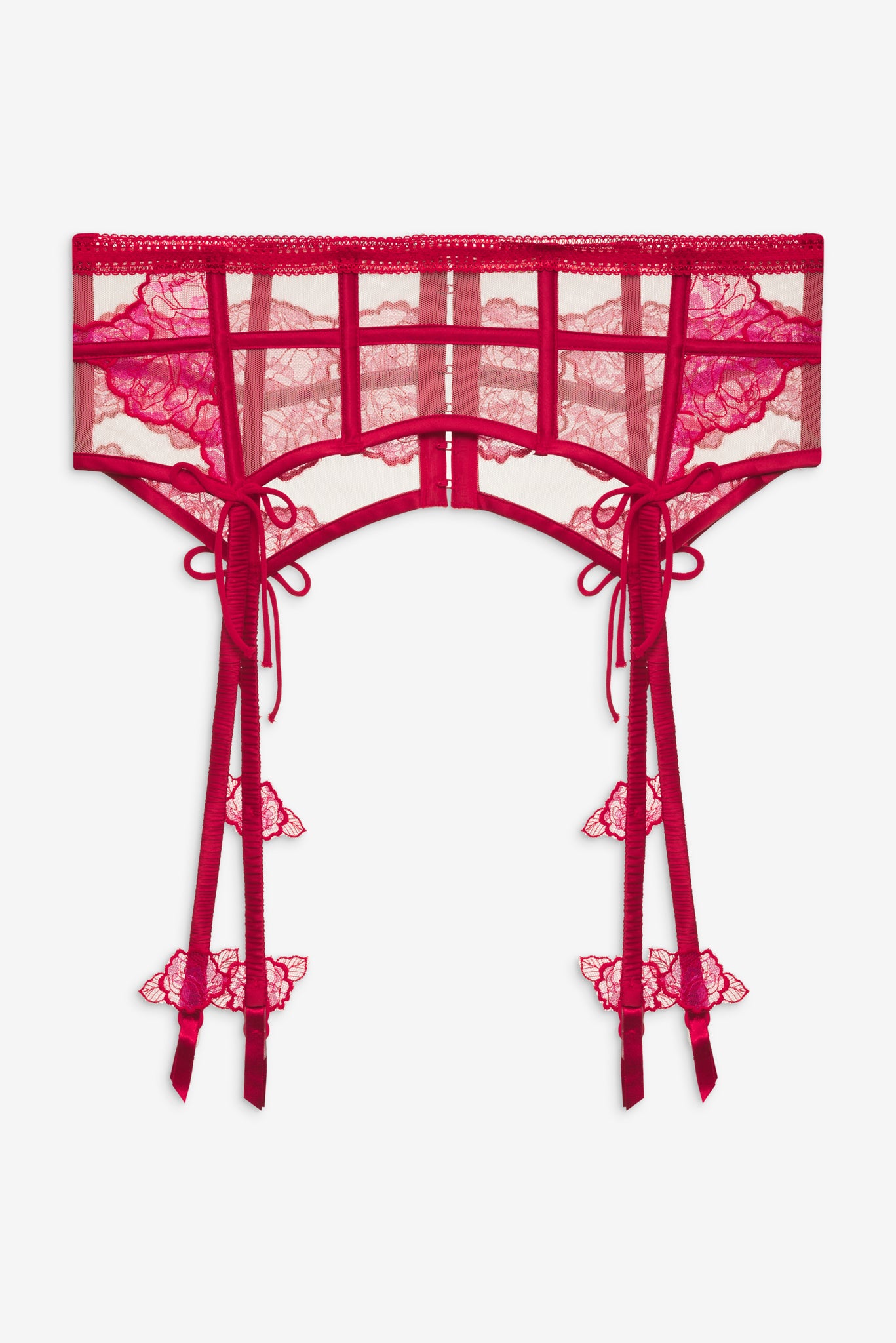 The Cordelia Garter belt adds some intrigue to your lingerie set with its silk-like scrunchie garter straps featuring romantic rose applique detailing, and decorative bow ties. Style this red garter with more seductive styles from the Cordelia Collection.