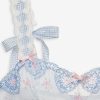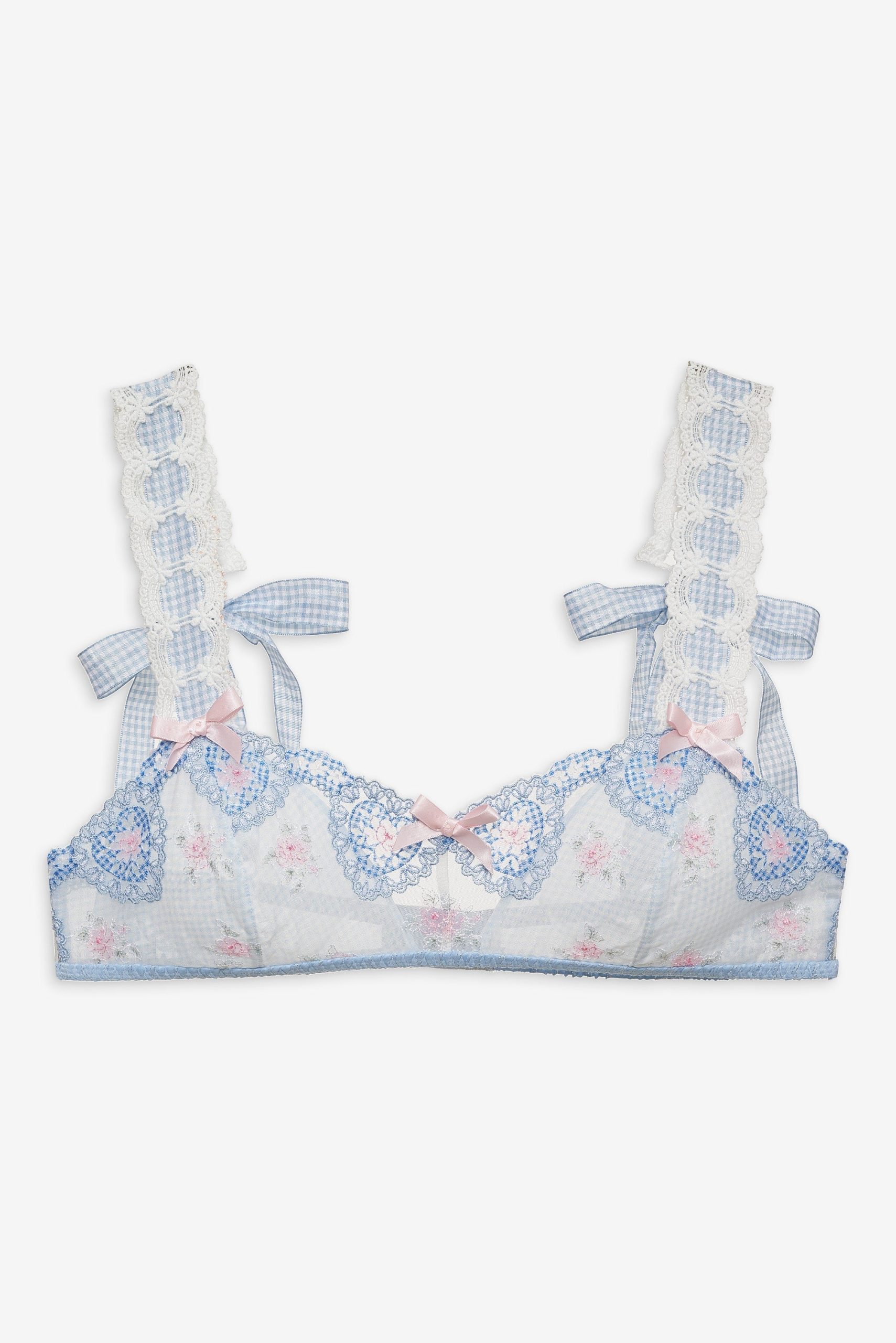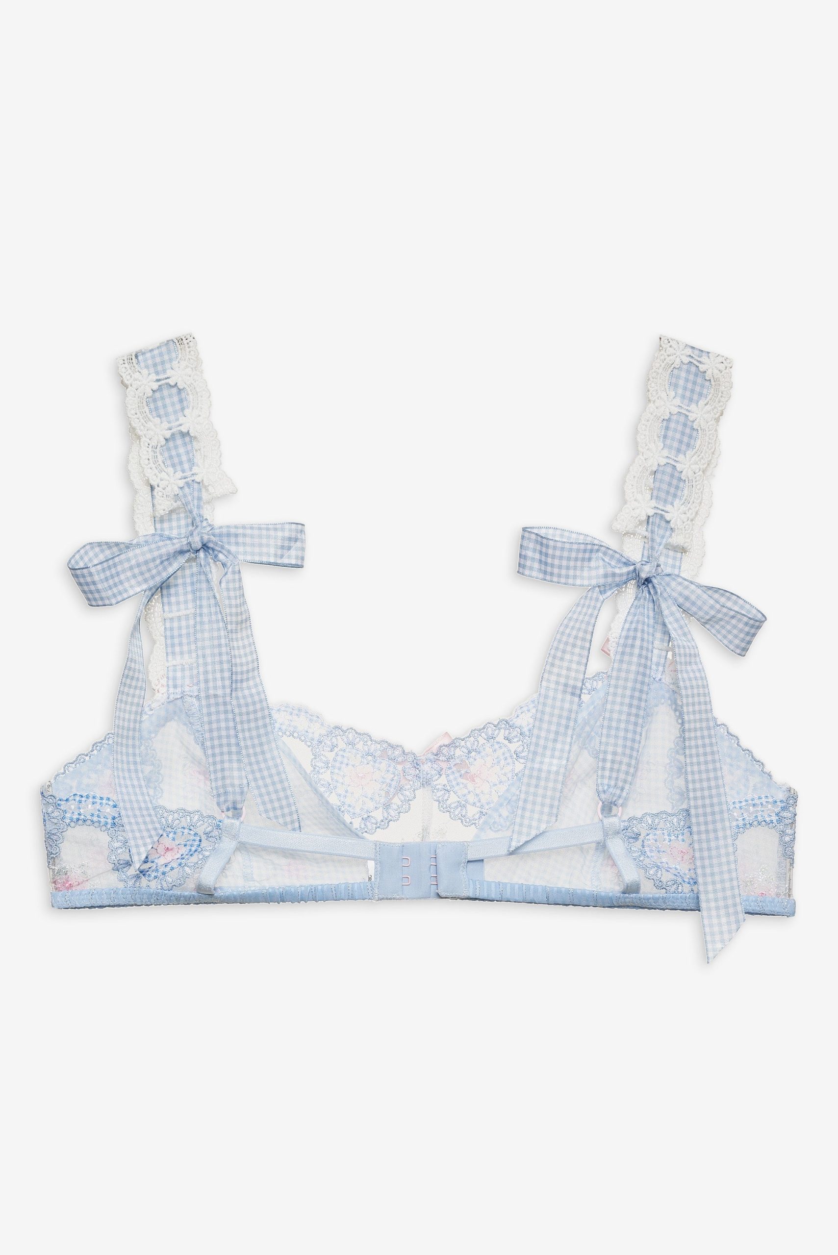 Capture the delicate charm of a festival romance with the Dainty Doily sheer bralette–a blue bralette crafted in a sheer floral and doily heart embroidered mesh. Featuring eyelet gingham ribbon trim straps and adjustable gingham bows at back straps, this lace bralette is adorned with dainty bow appliqués throughout.
