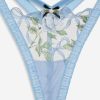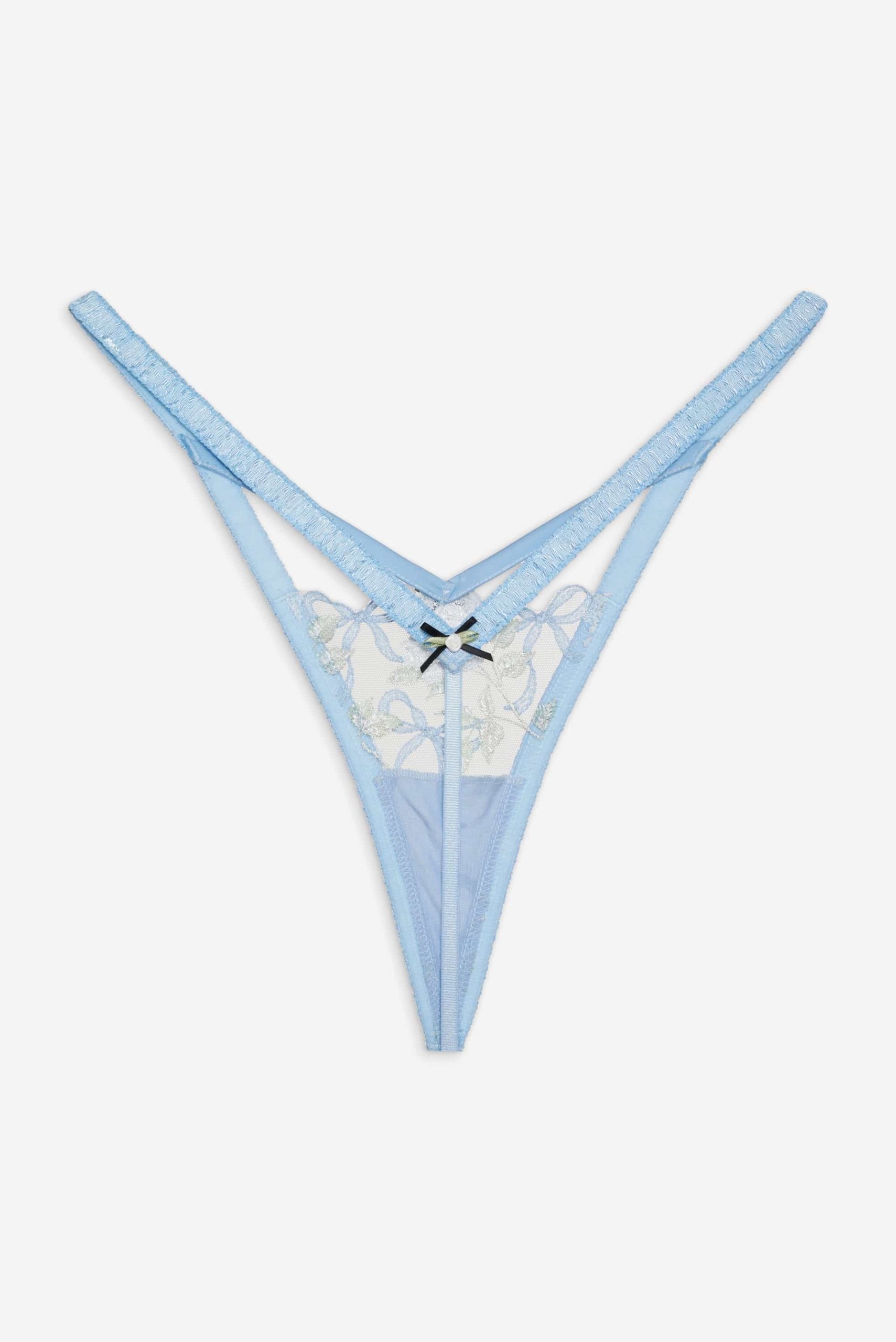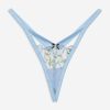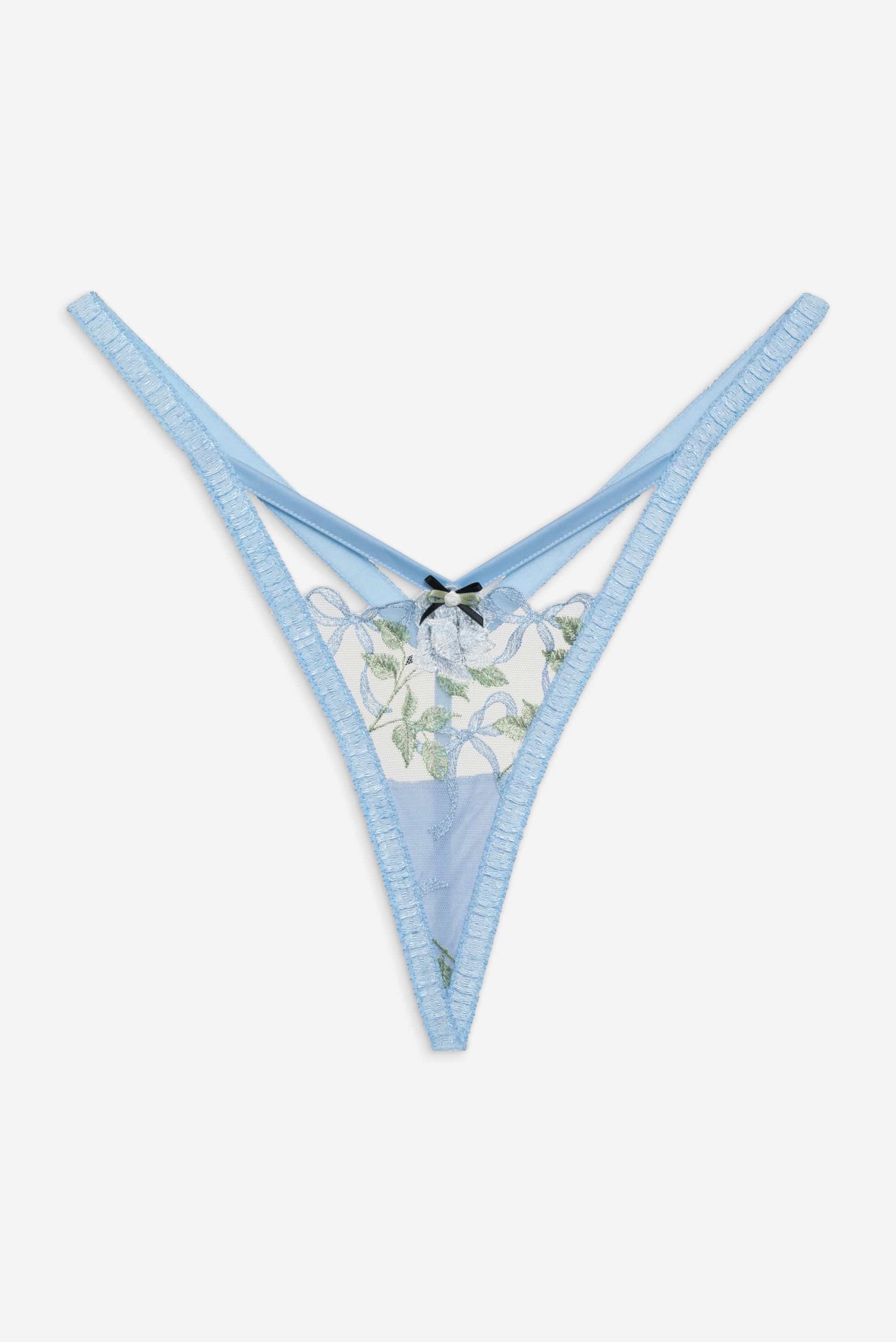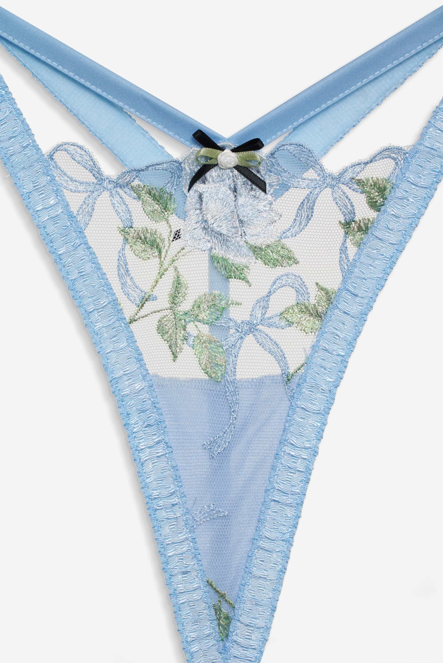Crafted for the coquettish Muse—the Dawn blue thong spotlights elegant rose and bow embroidery with a satin rosette bow at the front. This g-string can be paired with the Dawn Underwire Bra and Garter Belt for a co-ord lingerie set.