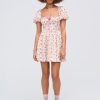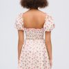 A chic mini dress for the warm days of late summer and early fall, the Etienne floral dress is rendered in a romantic pink floral print. Featuring puff sleeves with ruffles, a corset-like bodice with boning, and decorative pintucks—this satin mini dress is as flattering as it is feminine.