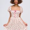 A chic mini dress for the warm days of late summer and early fall, the Etienne floral dress is rendered in a romantic pink floral print. Featuring puff sleeves with ruffles, a corset-like bodice with boning, and decorative pintucks—this satin mini dress is as flattering as it is feminine.