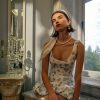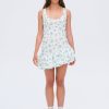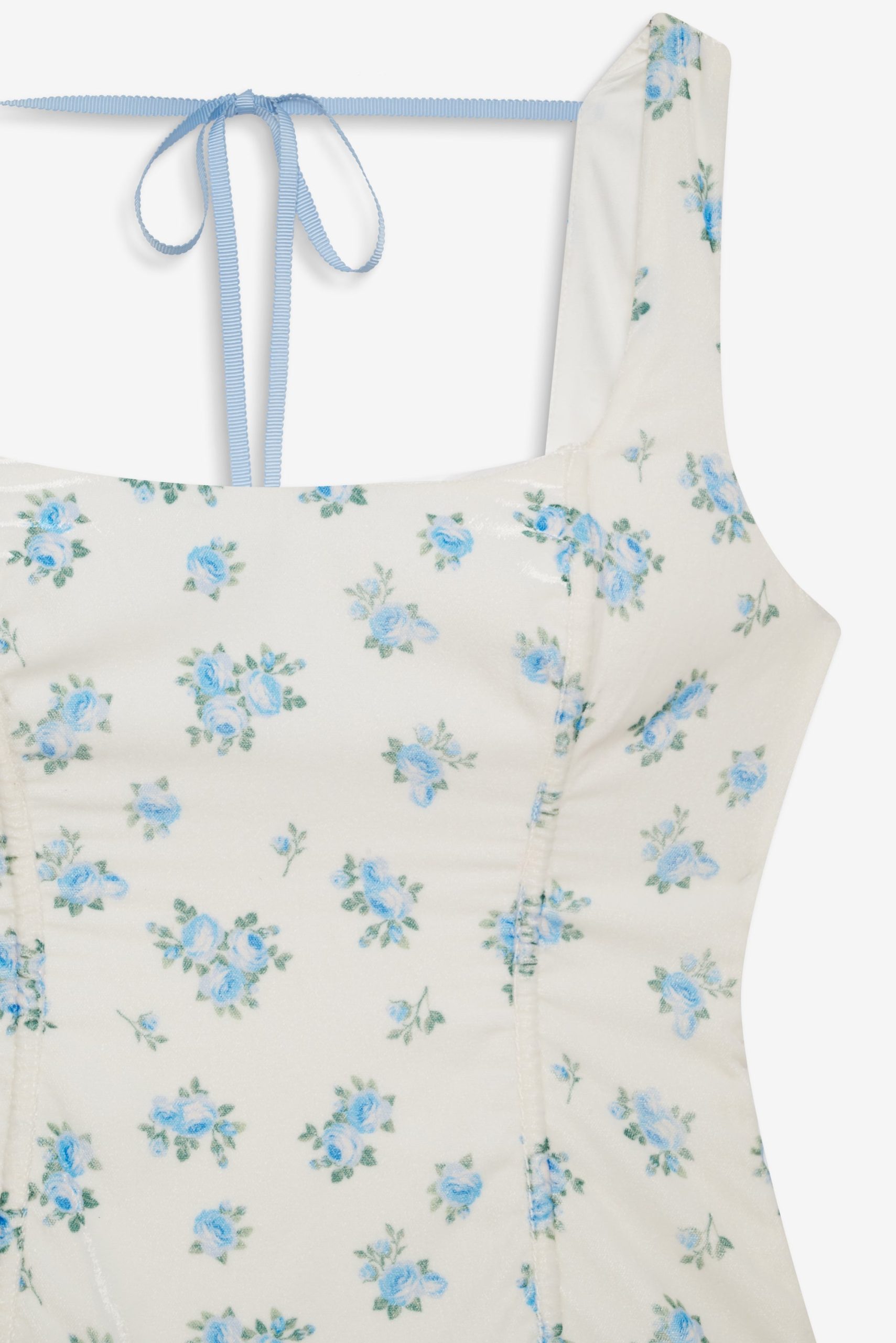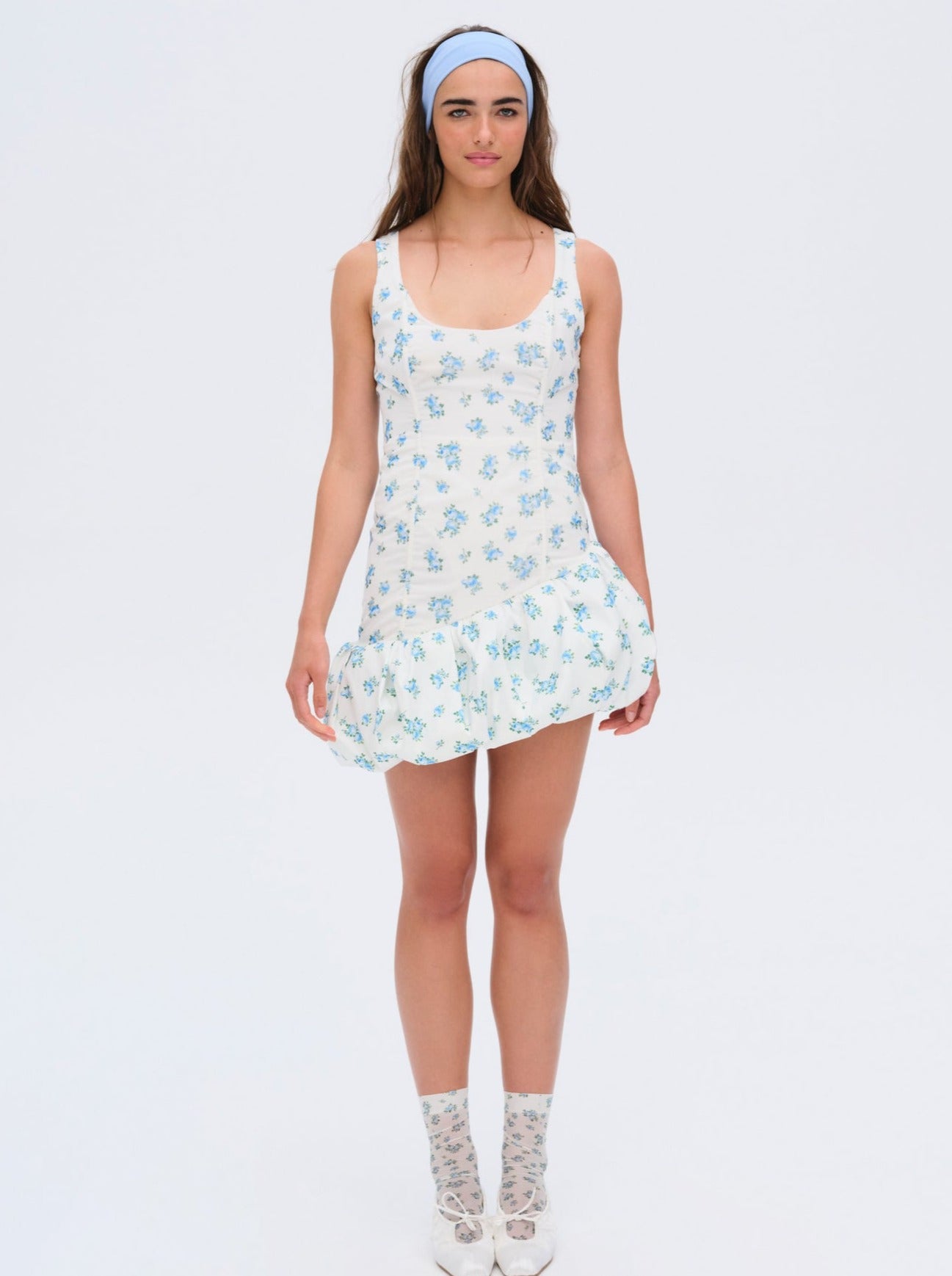 The Évelyne blue mini dress has arrived, and she’s as sweet as our favorite dessert. Crafted in velvet with an allover pastel floral print, this short bubble hem dress with an asymmetrical hem showcases our silhouette of the season: the puff.