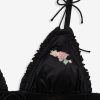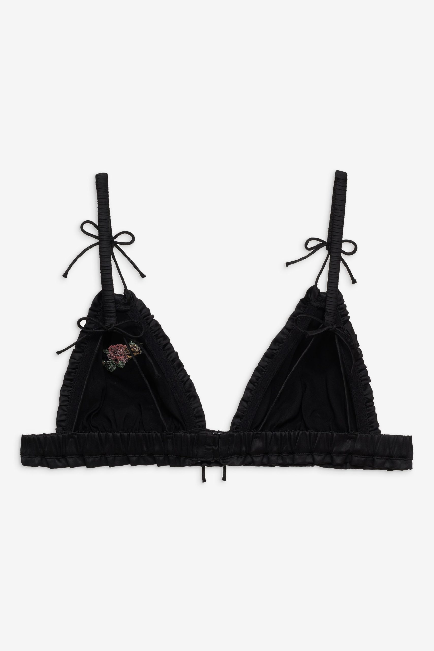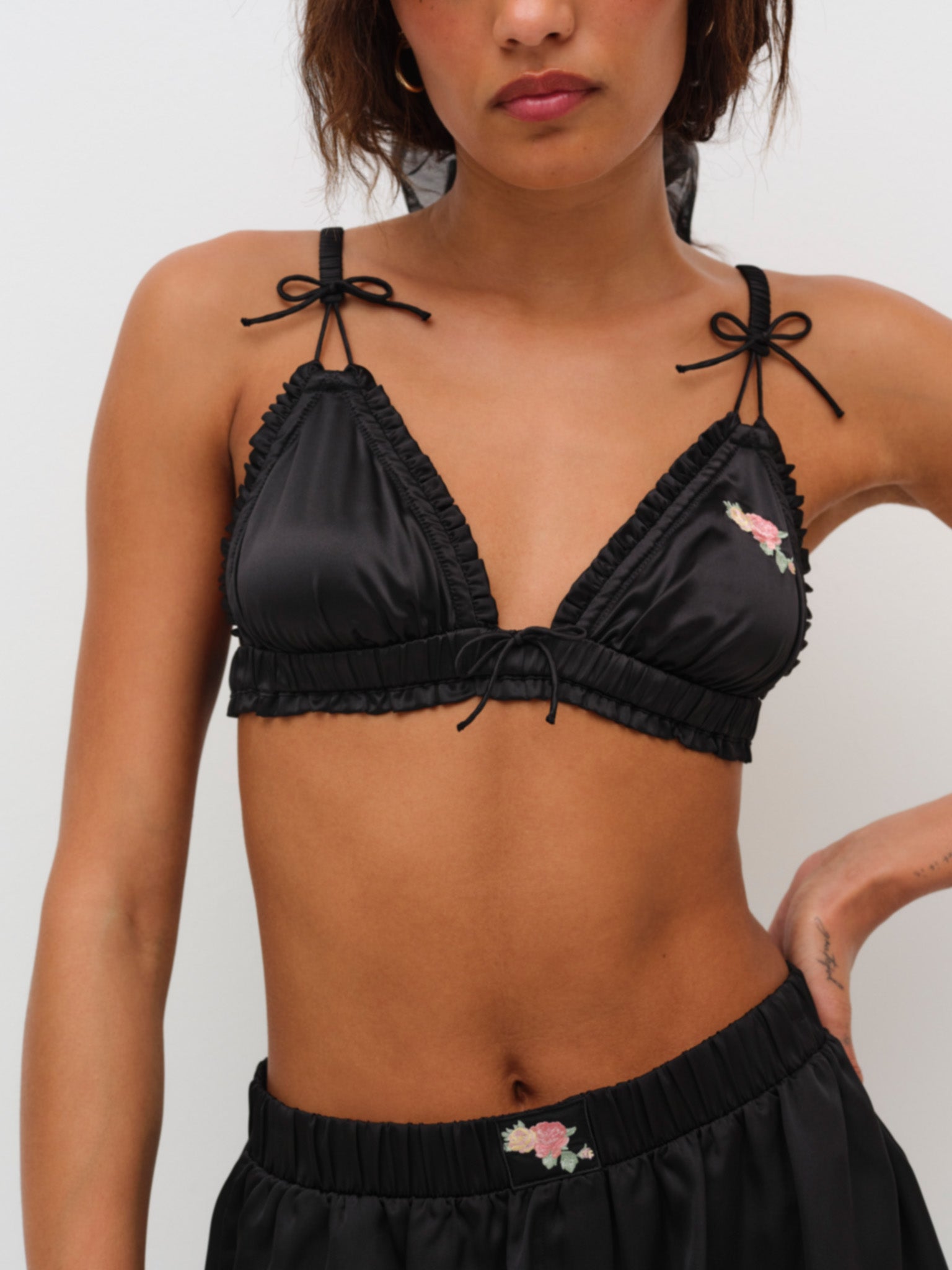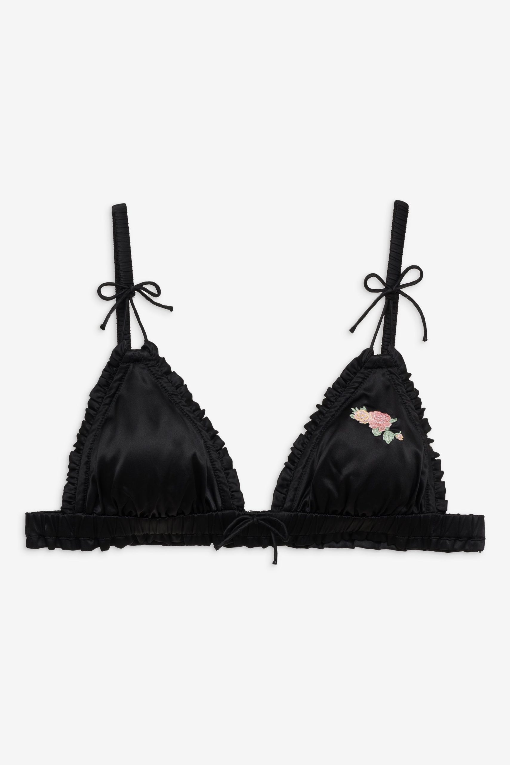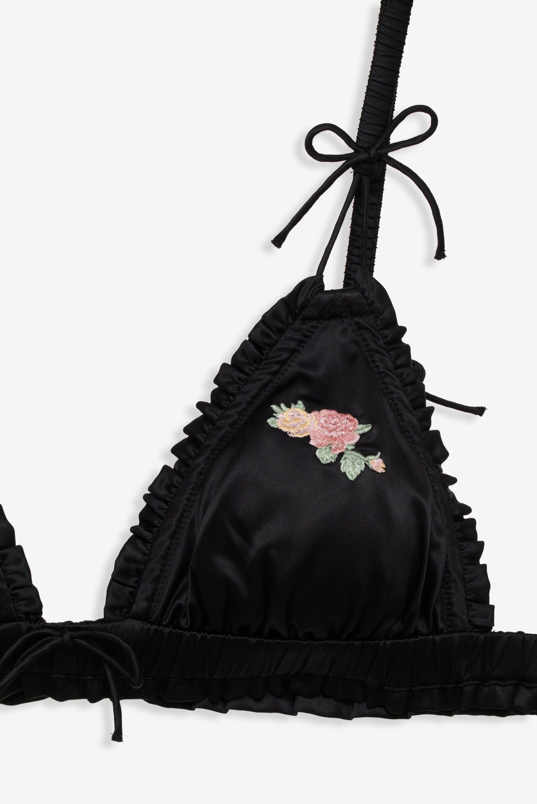 A bestselling silhouette—the Everyday blue bralette highlights the beauty of everyday rituals. This triangle bralette is defined by its satin ruffles, satin skinny tie bows, and floral bouquet embroidery at the left cup. For the full lingerie set, pair it with the Everyday Thong Panty.