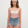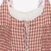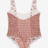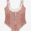 Inspired by vintage festival aesthetics, the Georgia gingham bodysuit features an exposed ruched shelf bra and lace-up corset waist that exudes idyllic charm. This thong bodysuit is rendered in a gingham and dainty floral print, andfeatures elasticized smocking panels at side seams, ruffled leg openings, and scrunchie shoulder straps.