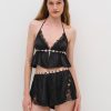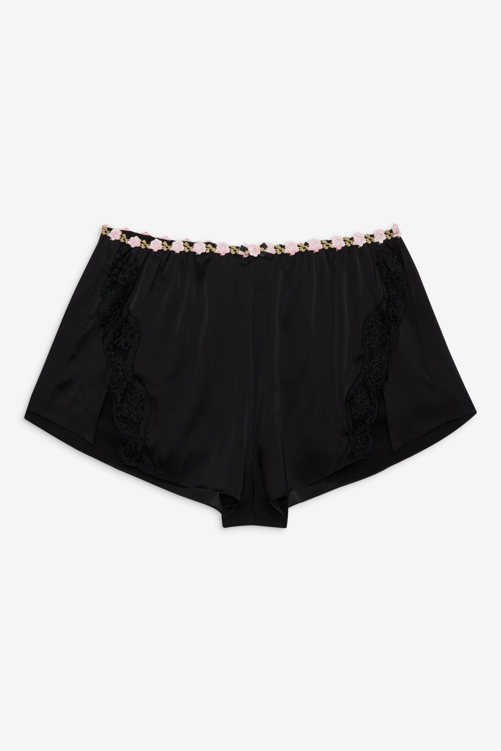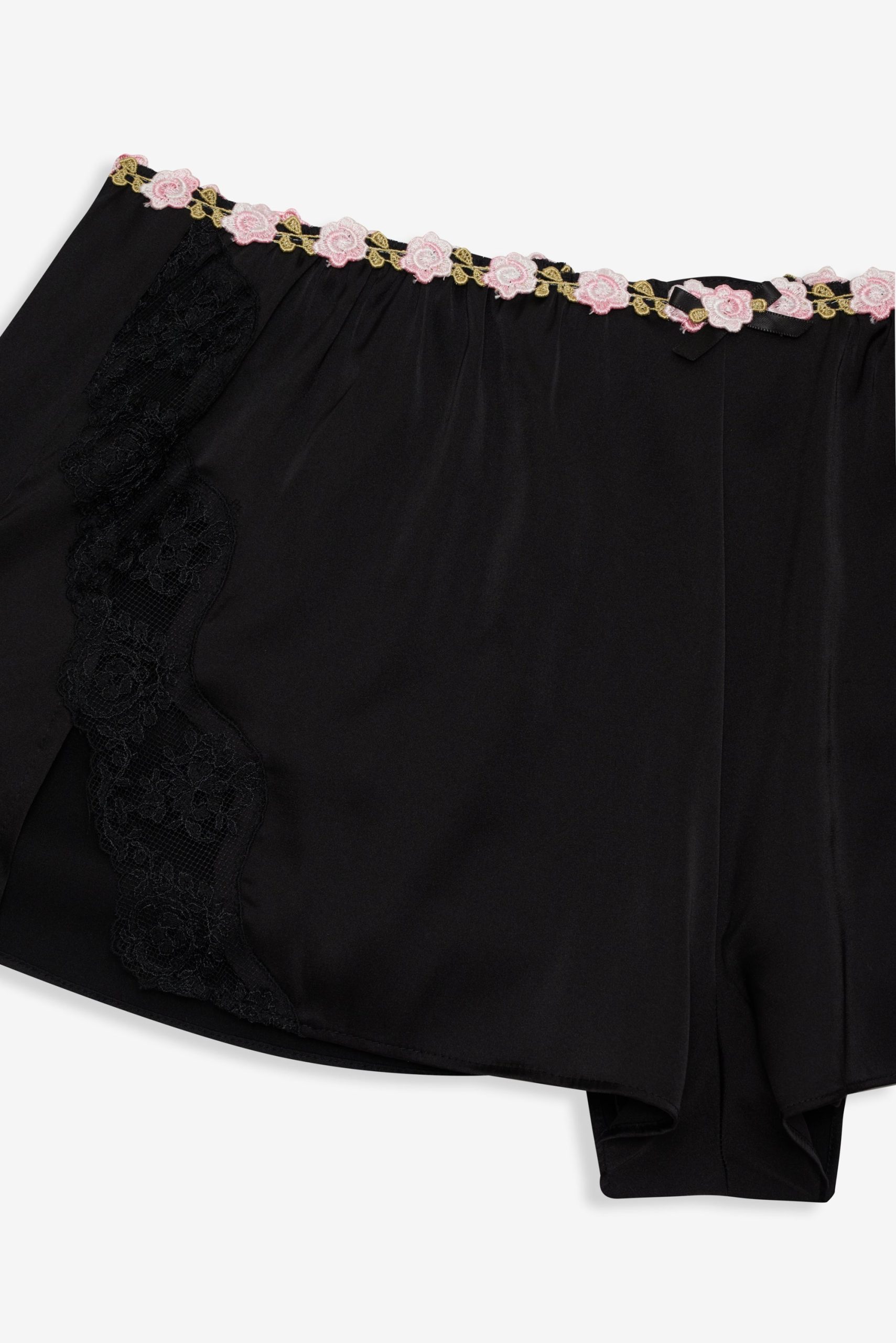 Taking inspiration from vintage sleepwear styles, the Gertrude black pj shorts are designed for enjoying life’s quiet interludes. Featuring a fluttery silhouette with slits at the thigh, this sleep short features an antique-like floral trim at the waist and lace at the front princess seams. Pair it with the matching Gertrude Sleep Top for a matching pj set.