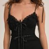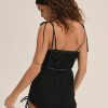 The Joan black romper is an ode to summer days and nights you never want to end. Crafted in a soft rib knit, this one-piece teddy features lace trims and a slotted grosgrain lace trim at the waist.