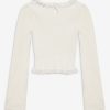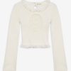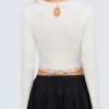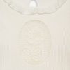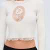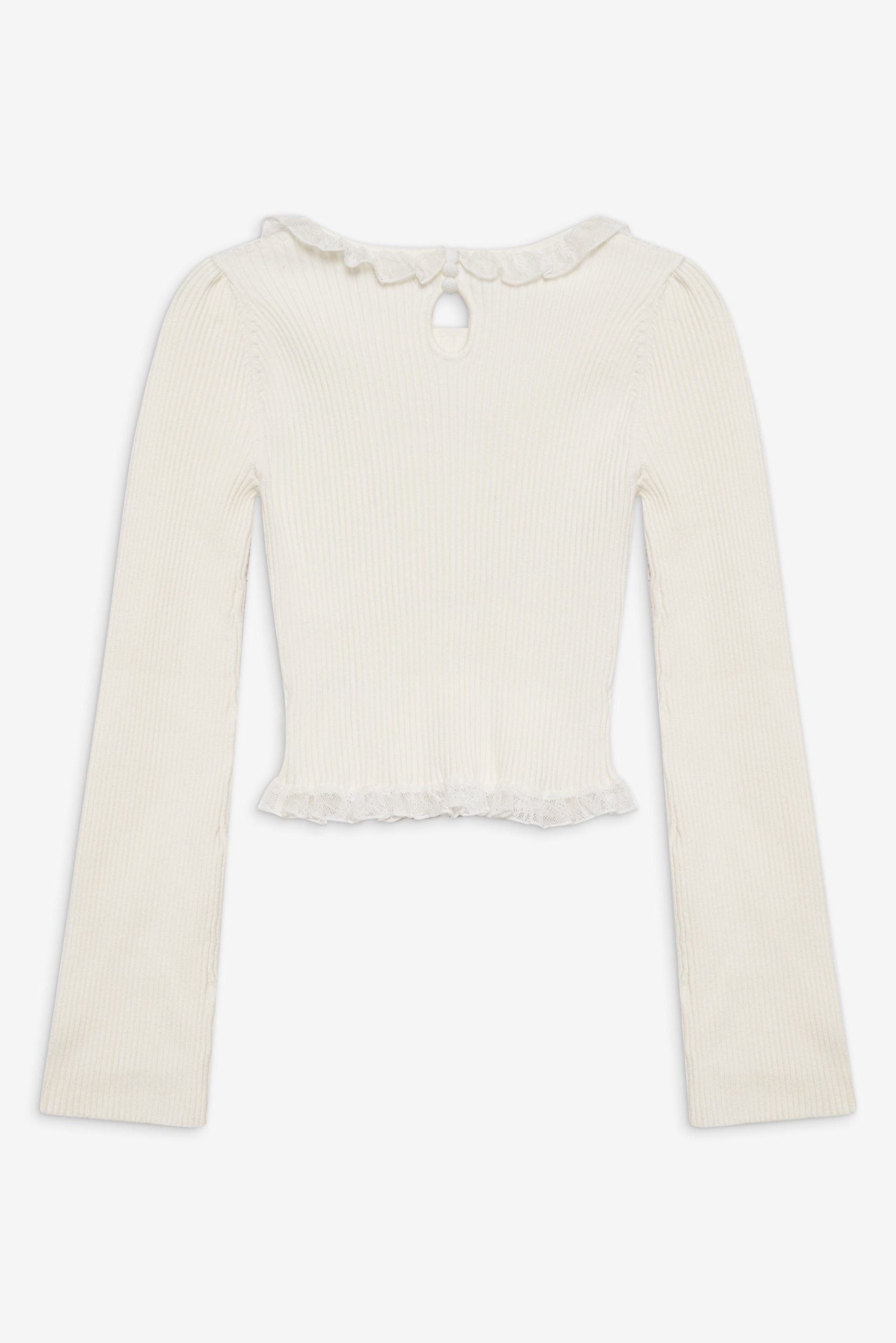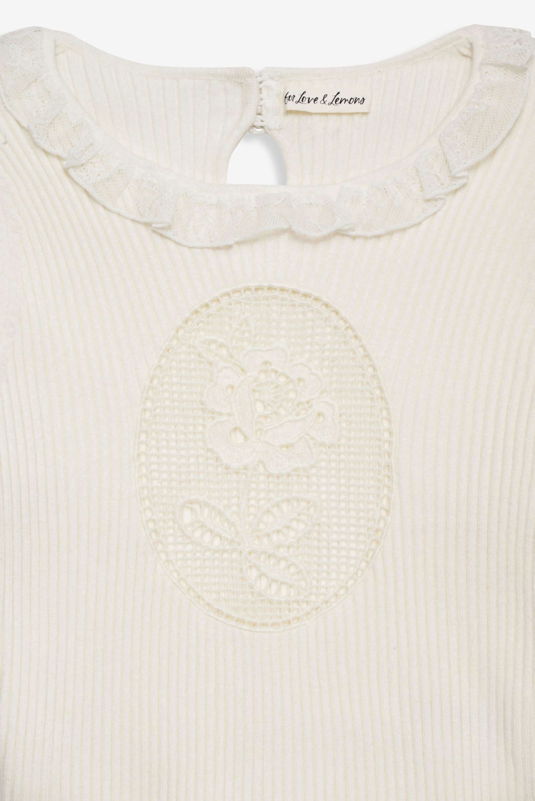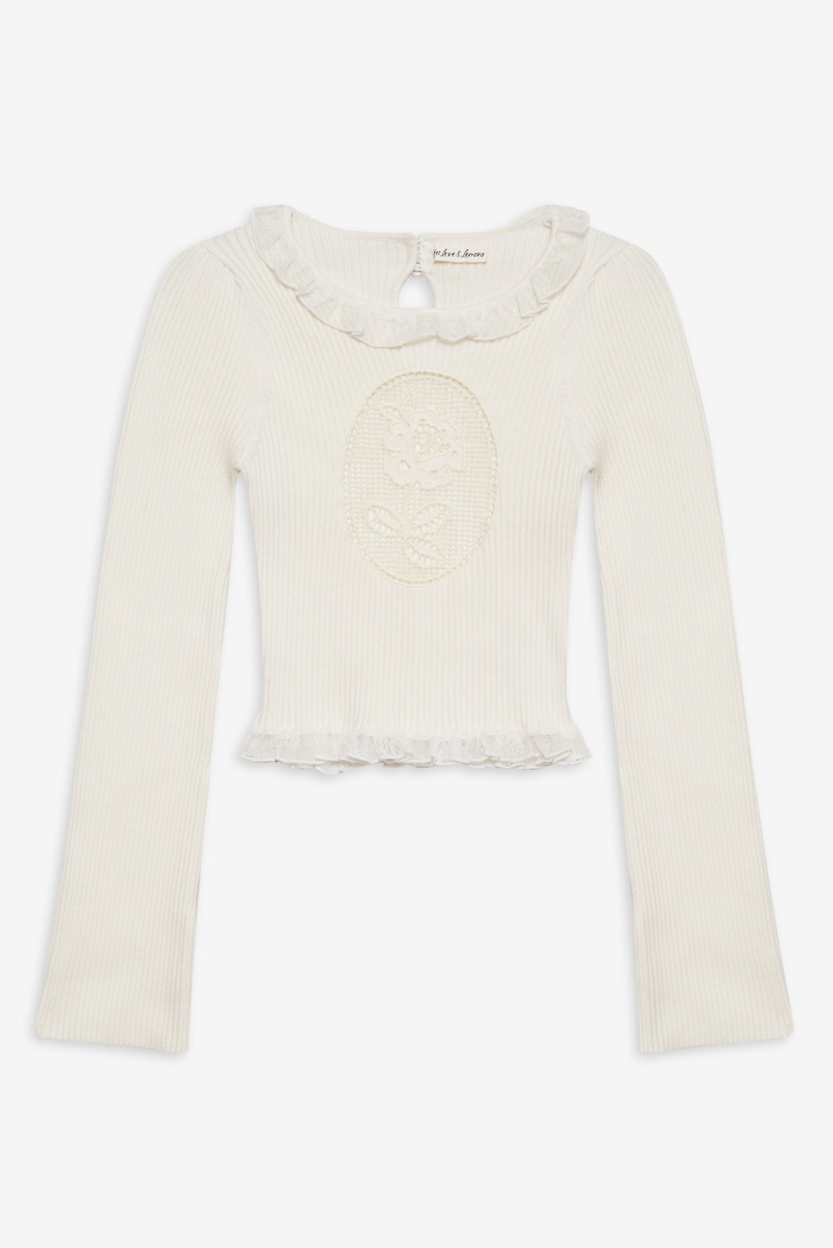 Inspired by vintage motifs, the Lyon white knit top shows off an inset rose cameo at the bust. This slightly cropped sweater is crafted in a ribbed knit and features a high neck with a lace ruffled trim.
