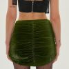 The Martini Olive green mini skirt is an ode to our favorite holiday cocktail. Crated in a luxe velvet, this ruched short skirt spotlights a large bow at the waist and an flattering petal hem.
