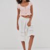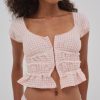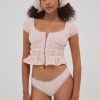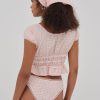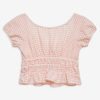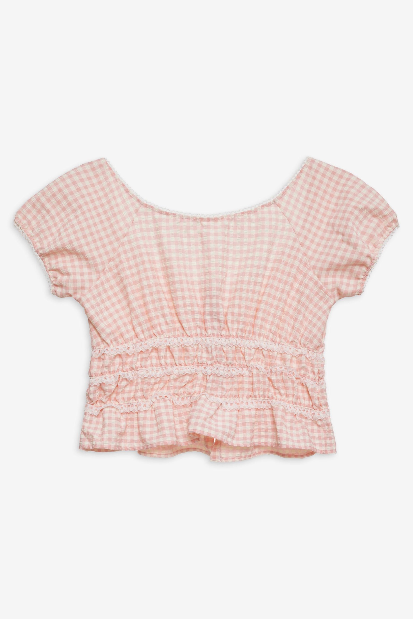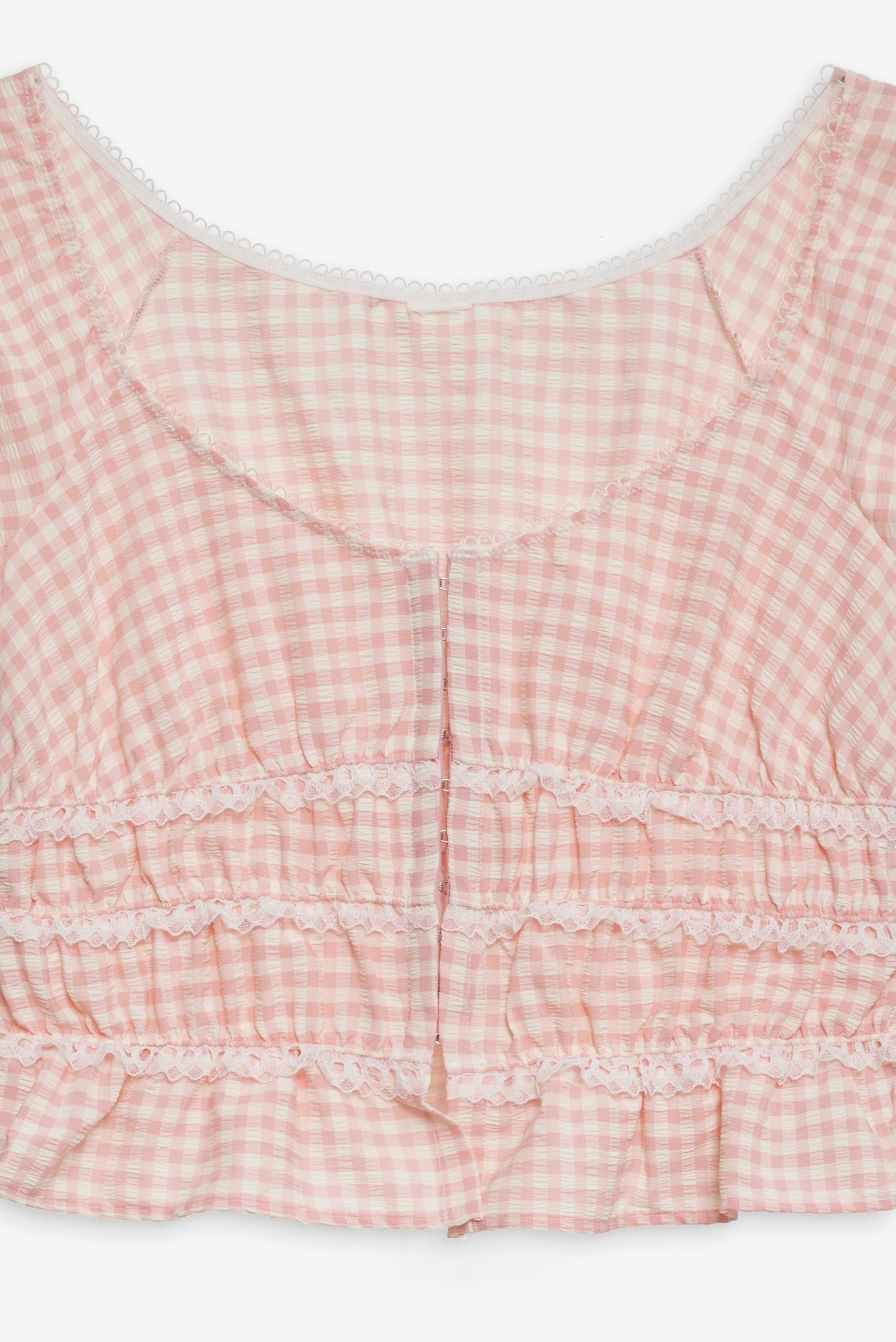 Crafted in a textured pink gingham fabric, the Petal gingham cap sleeve top mirrors the warmth of a Mediterranean escape. Featuring a ruched body and a lace trim that ruffles at the bodice seams this pink top is cut to a cropped length.