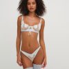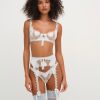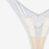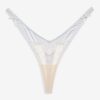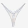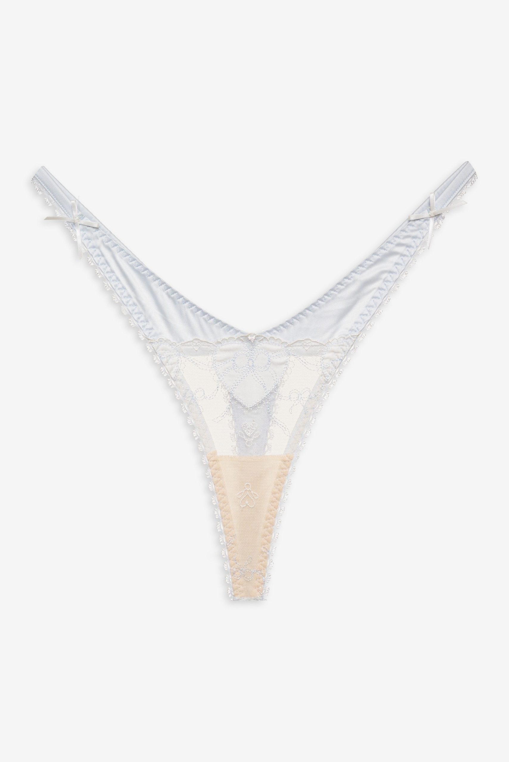 Fall in love with the Pure Heart blue & white panty–a g string crafted in a romantic heart embroidered mesh with contrast satin panels and adorned with picot elastic trim and bow appliqués.