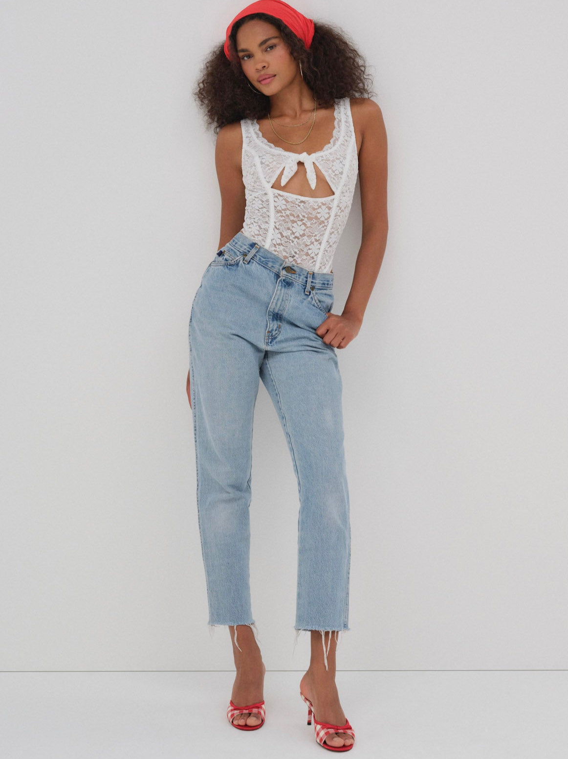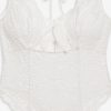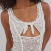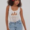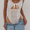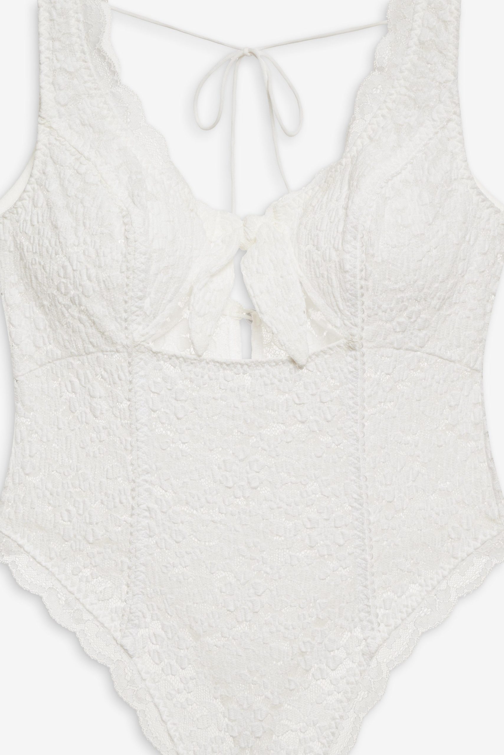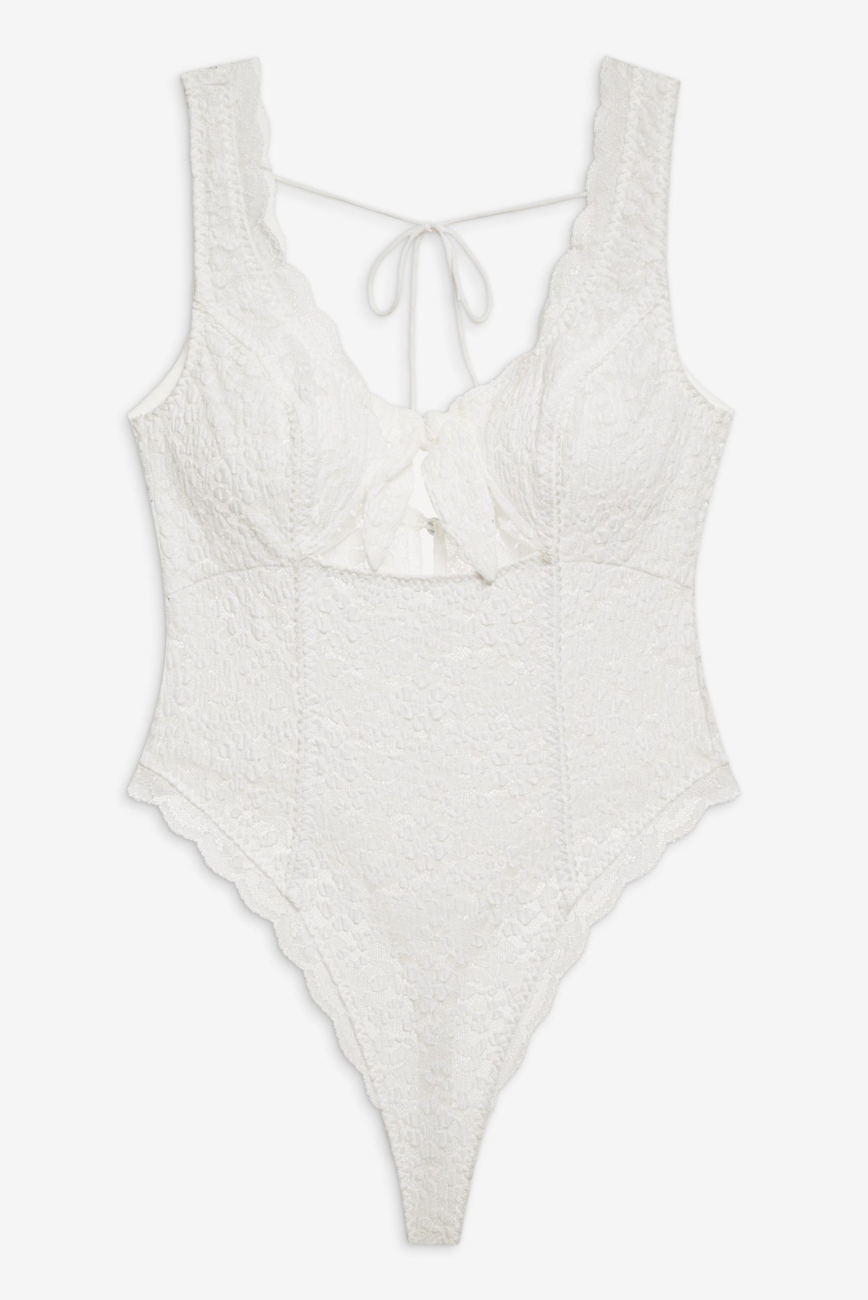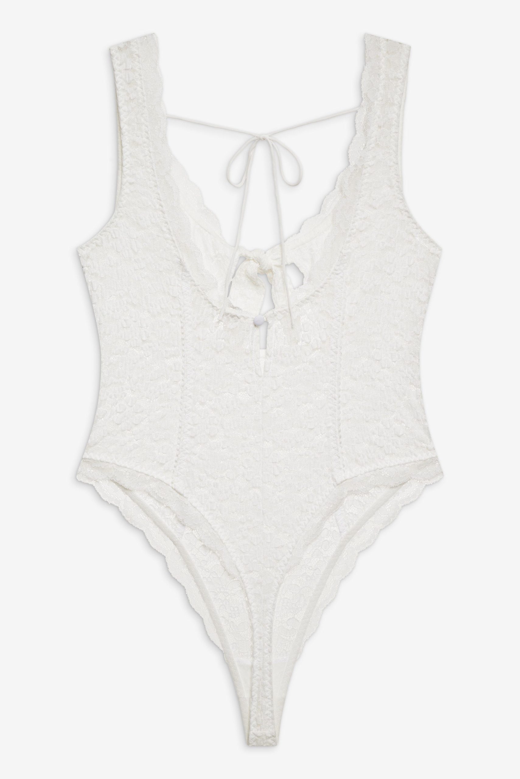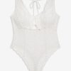 Made for barefoot walks in the grass, the Sally white lace bodysuit is for the effortless beauty. Crafted in an intricate floral stretch lace, this lace teddy features a cheeky back panty fit, keyhole cut out at front with functional knot tie, a low open back with functional tie, and is adorned with lace trims throughout.