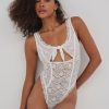Made for barefoot walks in the grass, the Sally white lace bodysuit is for the effortless beauty. Crafted in an intricate floral stretch lace, this lace teddy features a cheeky back panty fit, keyhole cut out at front with functional knot tie, a low open back with functional tie, and is adorned with lace trims throughout.