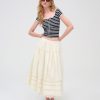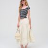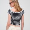 The Suzette stripe knit top exudes a timeless French aesthetic. Crafted in a cozy knit, this striped crop top features a wide scoop boat neckline, short cap sleeves, and is adorned with a lace trim and a fixed center-front bow.
