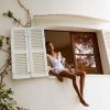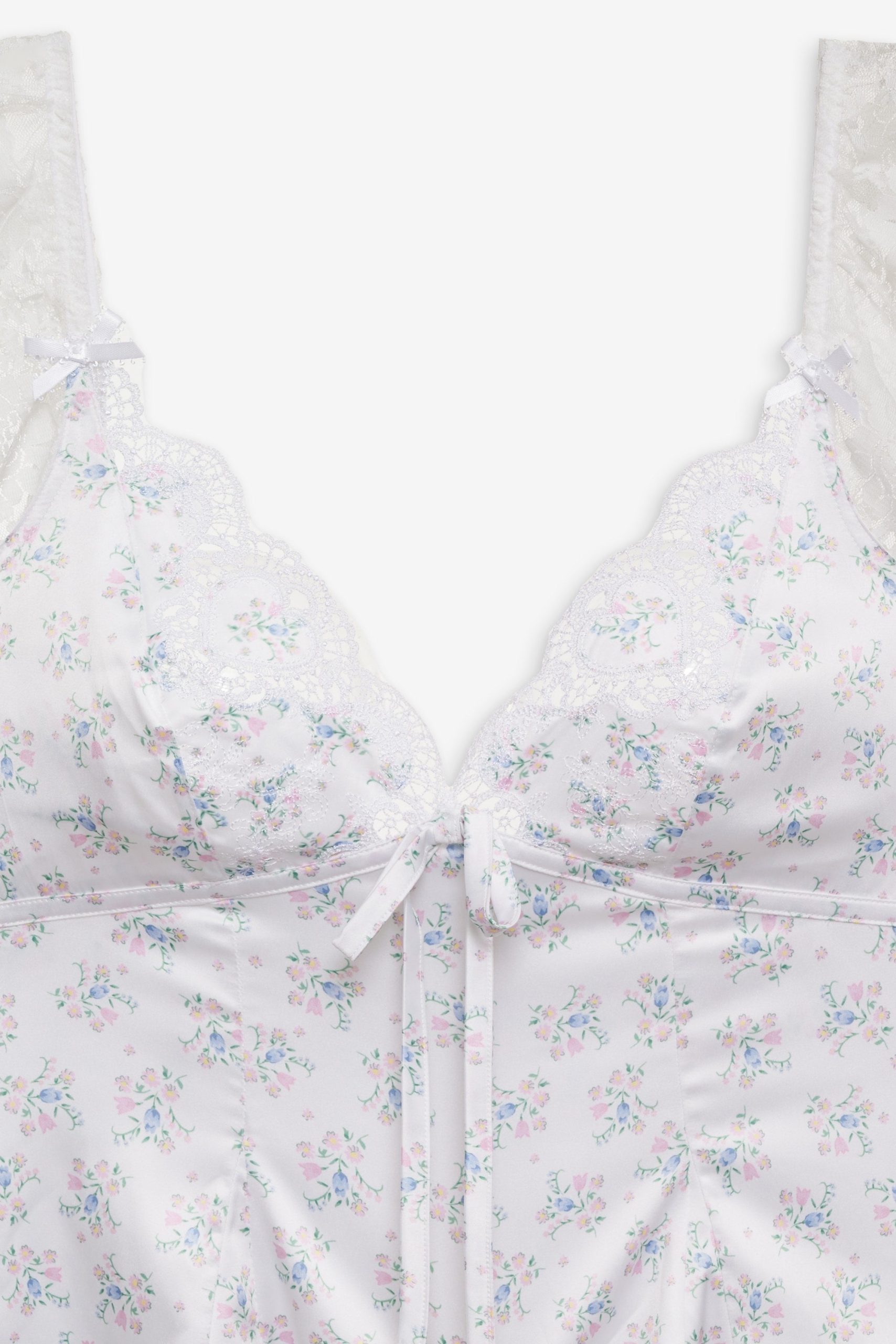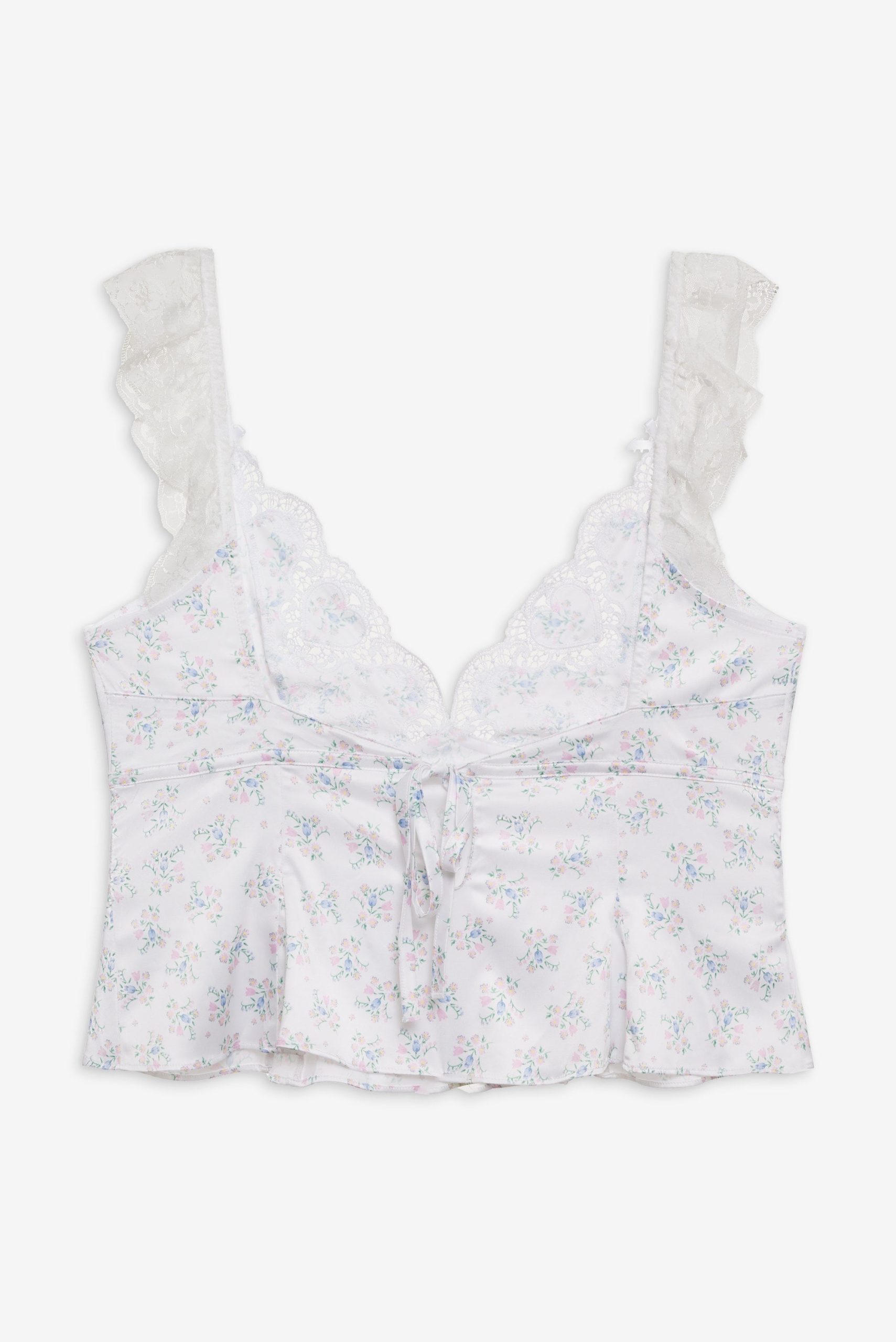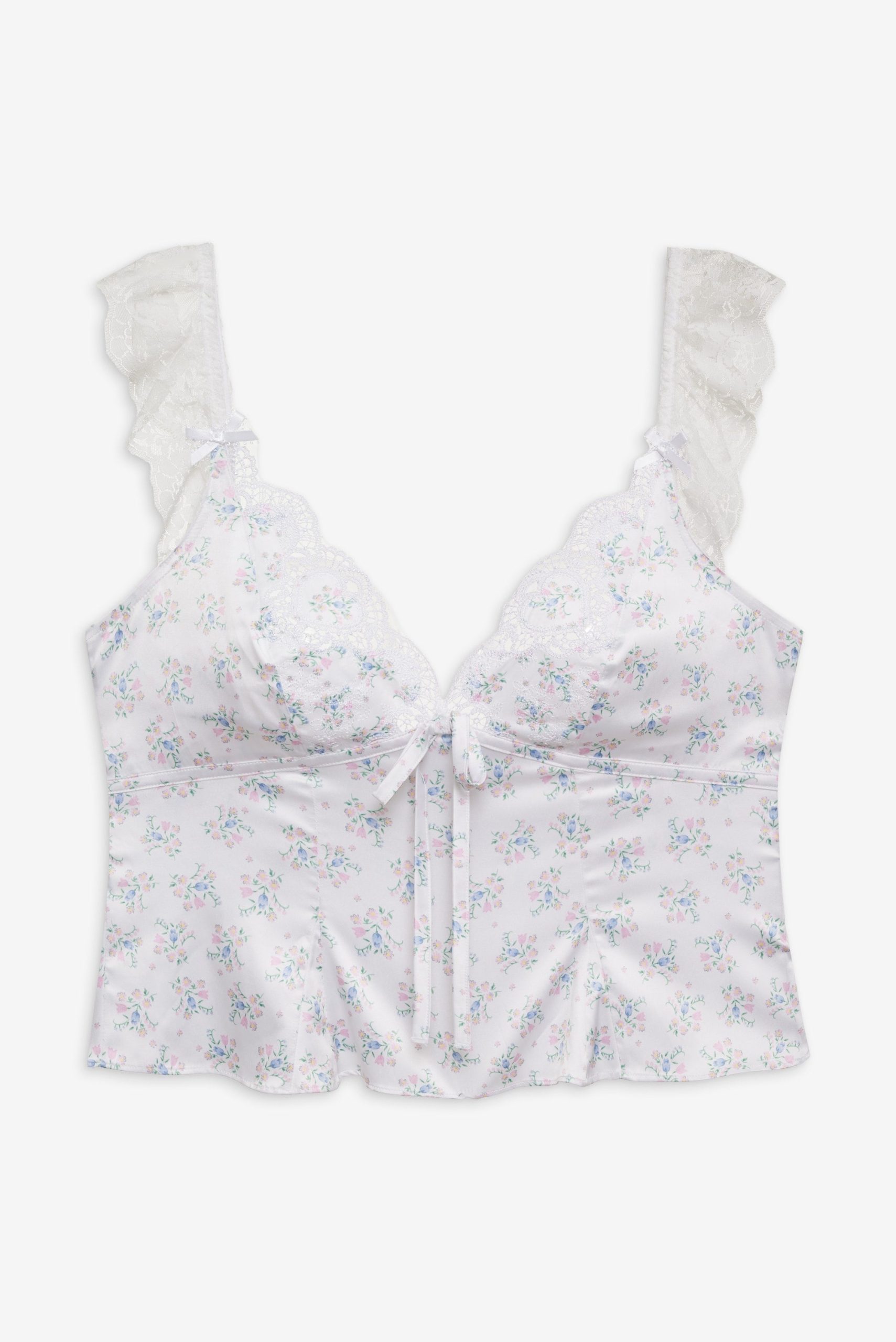 Inspired by heavenly European summers, the Sweet Escape white pajama top exudes timeless femininity. This printed satin top spotlights embroidery, lace ruffles at the shoulder straps, and satin ribbon lingerie bows—it’s designed to be fitted with a slight flare at the hem. Pair it with the Sweet Escape Sleep Short for the full satin pajama set.