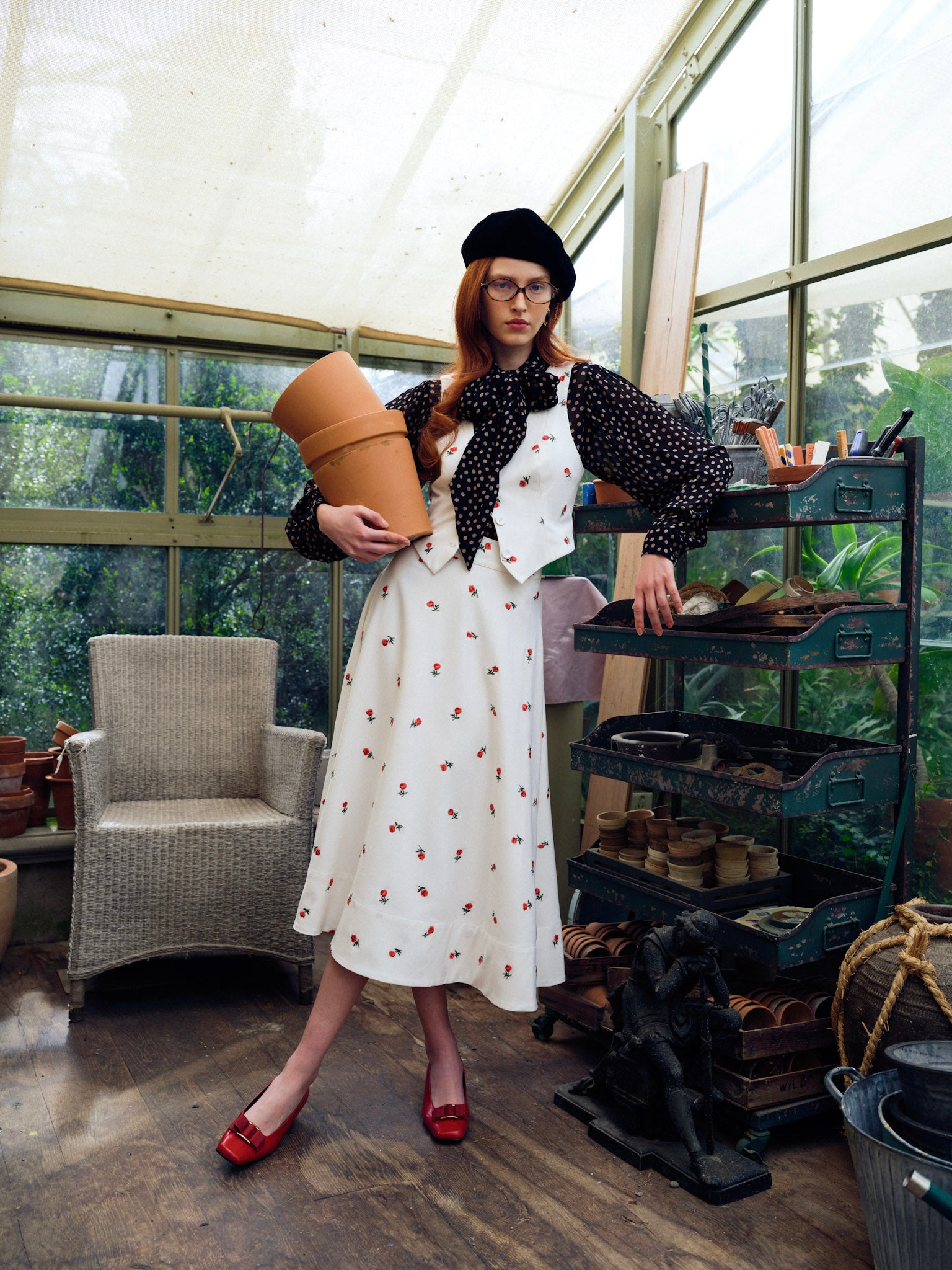 Become the ultimate Muse in wonderland in the Talia cream midi skirt, crafted in heavyweight twill and featuring allover rosebud embroidery. Style this A-line low rise skirt with the Talia Embroidered Vest for a chic co-ord skirt set.