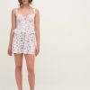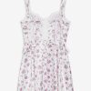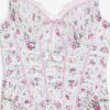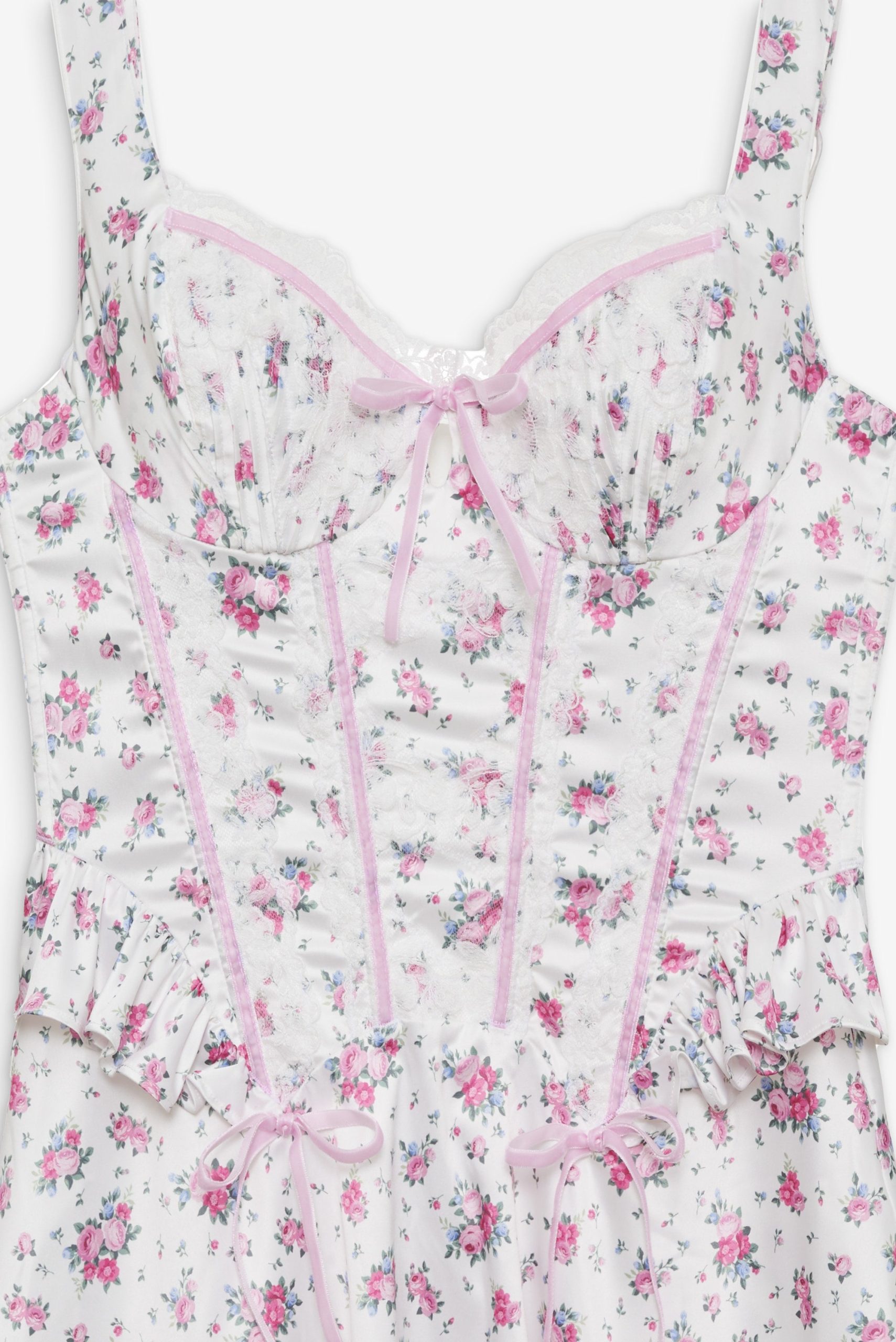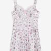 Inspired by vintage kitsch motifs, the That’s Amore slip dress makes for the perfect valentine’s day ensemble. This sweet and feminine white slip dress is crafted in a dainty floral printed satin, spotlighting a bustier style bodice, pin-tucked underwire cups, lace trimmings, and velvet ribbon bow at the center front.