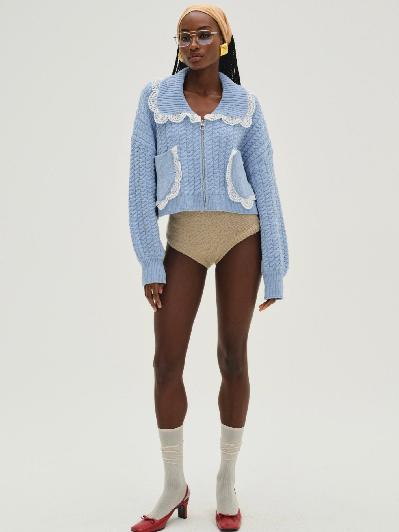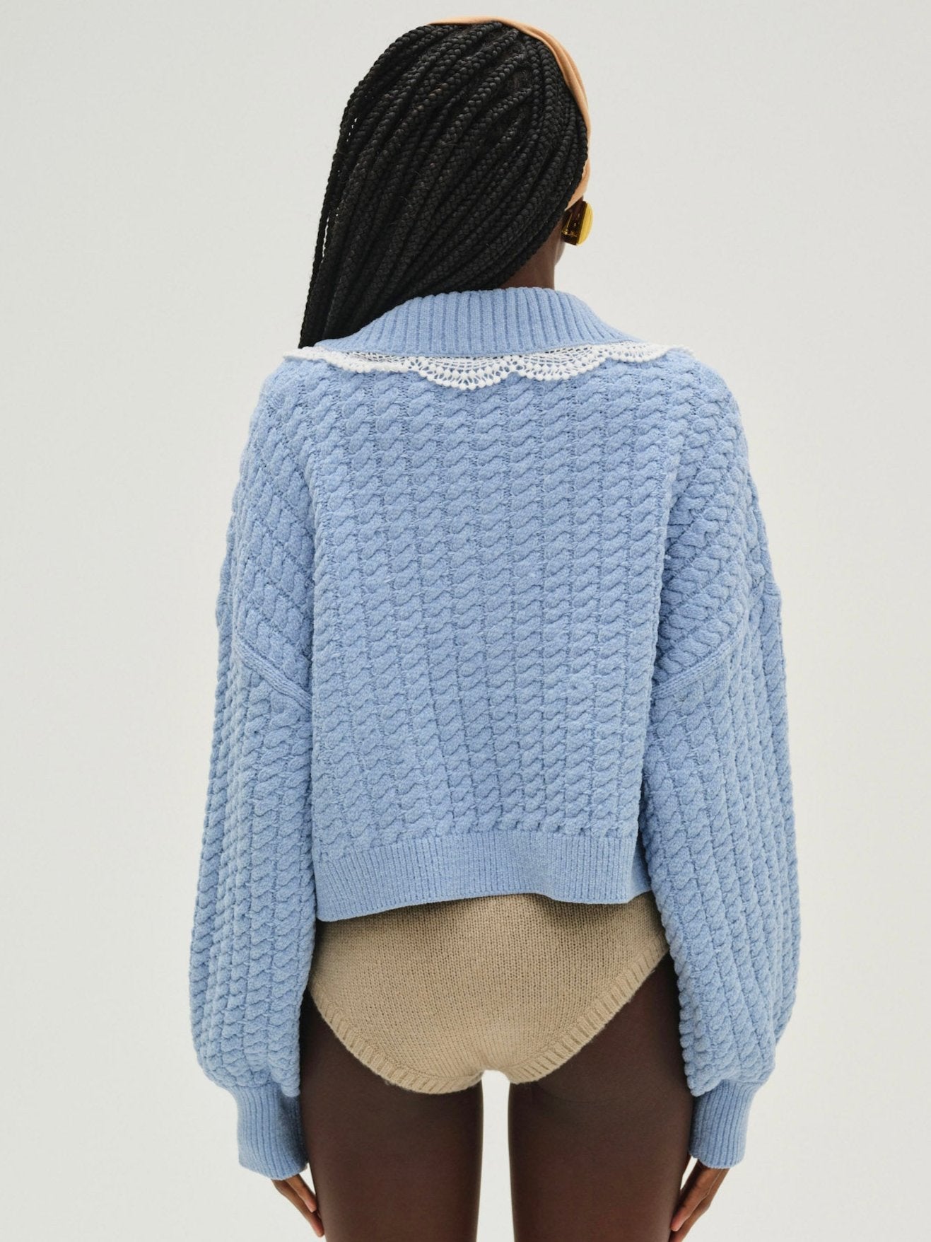 Constructed in a cozy chenille cable knit, this blue cardigan jacket has everyday appeal. Featuring a large rib collar and patch pockets with lace trims at the edges—this zip up cardigan features dropped shoulders for a vintage-inspired aesthetic.