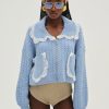 Constructed in a cozy chenille cable knit, this blue cardigan jacket has everyday appeal. Featuring a large rib collar and patch pockets with lace trims at the edges—this zip up cardigan features dropped shoulders for a vintage-inspired aesthetic.