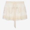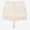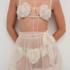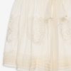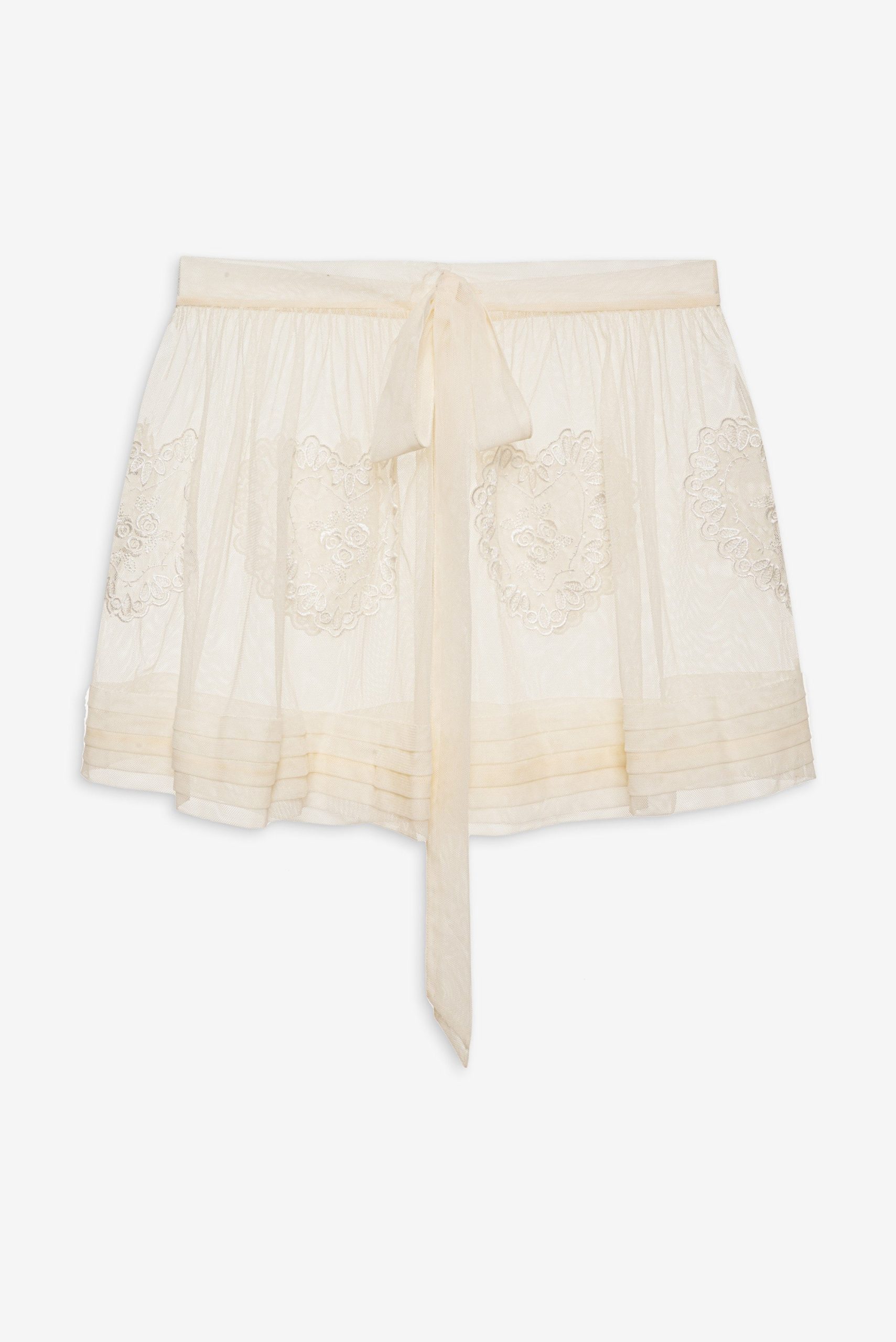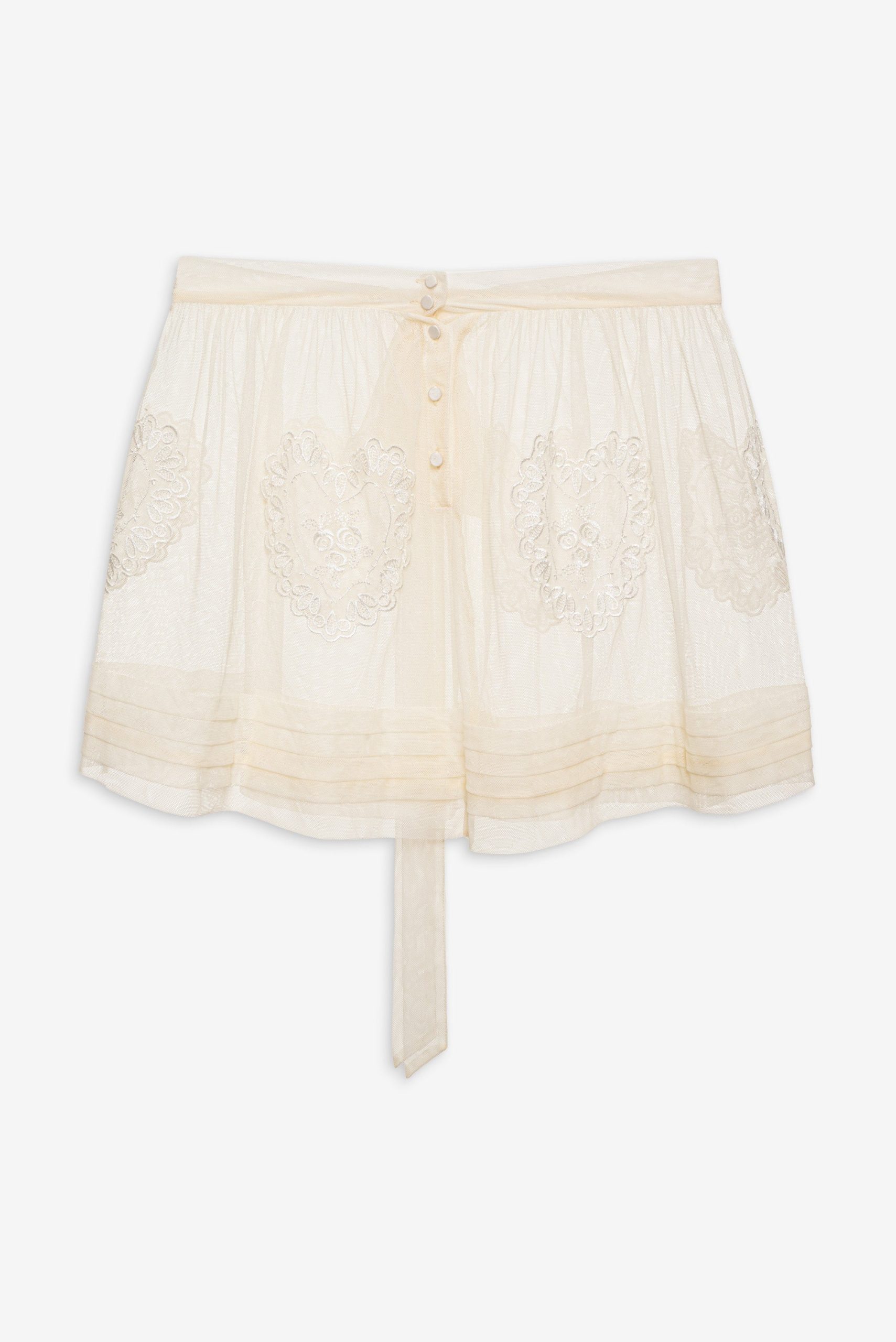 An ode to nostalgic lingerie of eras past–the Vintage Embroidery tulle skirt exudes antique charm. Crafted in delicate tulle, this sheer skirt is adorned with heart embroidered appliqué patches and a self-tying tulle waistband that wraps over side seam opening.