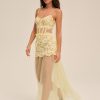 Dress for the Riviera with the Viola lace maxi gown–a butter yellow dress crafted in a classic floral lace and adorned with scallop hems at mini length. This corset dress features a boned sheer mesh bodice, functional dome buttons down center-front, and a sheer tulle maxi skirt for an effortlessly feminine chic look.