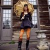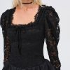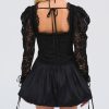 Designed for the elegant Muse, the Waverly black mini dress evokes a vintage aesthetic with its square neckline and puff sleeves. Crafted in lace, this black lace dress is contrasted with a taffeta bubble skirt and finished with a velvet ribbon that runs through the neckline.
